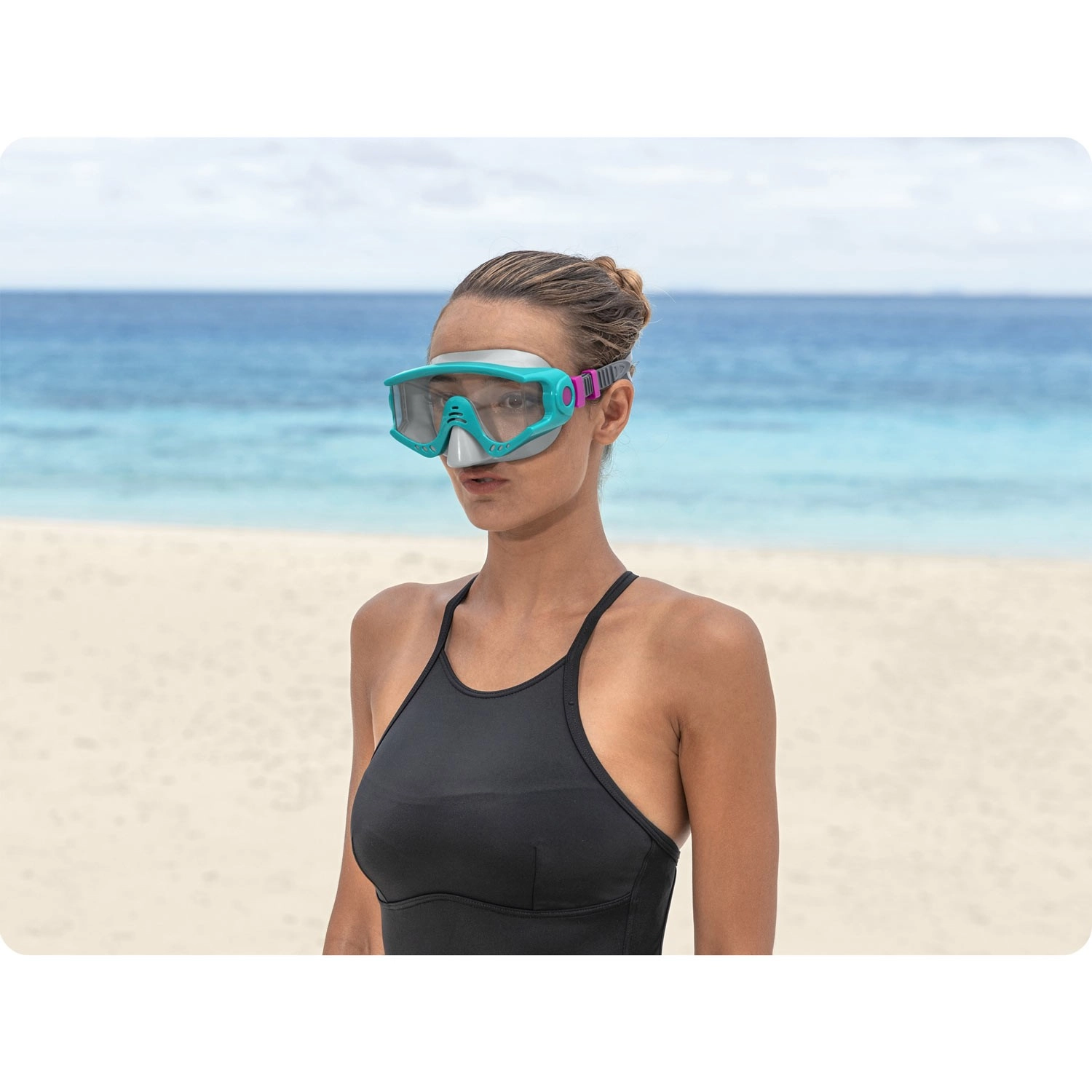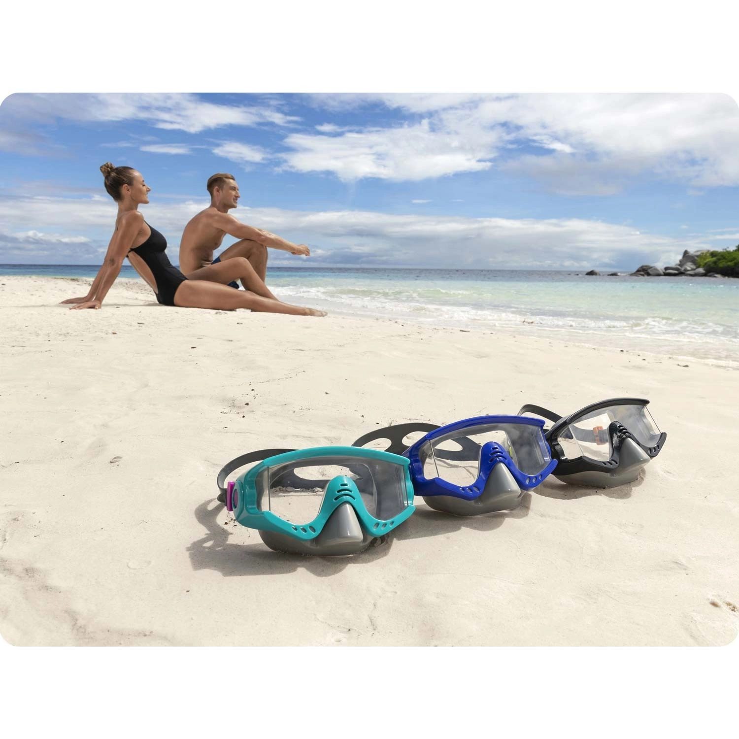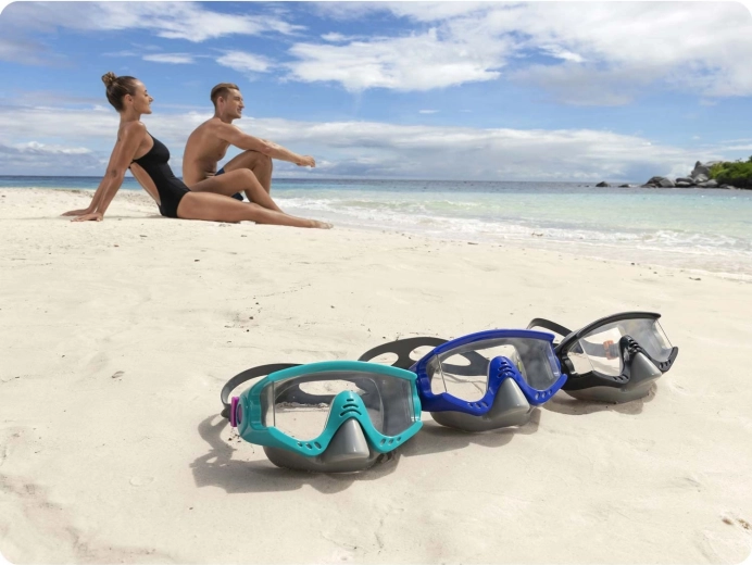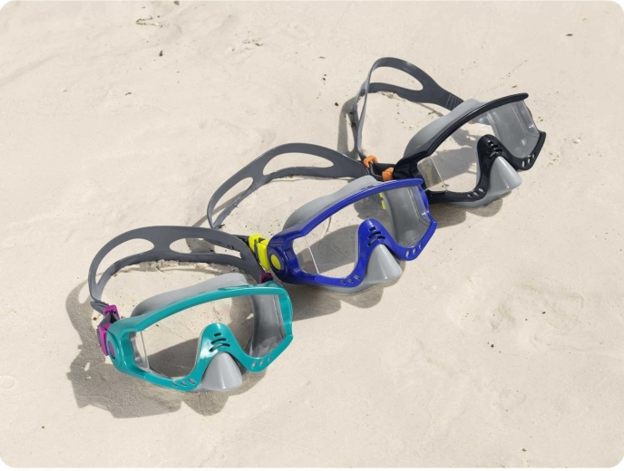 Fedezze fel a víz alatti világot kényelemmel és tiszta kilátással. Ez a türkiz színű búvármaszk a BESTWAY-től széles látómezőt, UV-védelemmel ellátott polikarbonát lencsét és puha szilikonpántot kínál a biztonságos, szoros és kényelmes illeszkedésért szivárgás nélkül. Az univerzális méret és a latexmentes kialakítás nagyszerű élményt biztosít úszáshoz és sznorkelezéshez is.