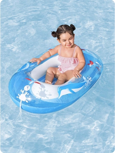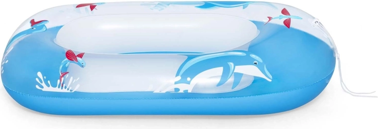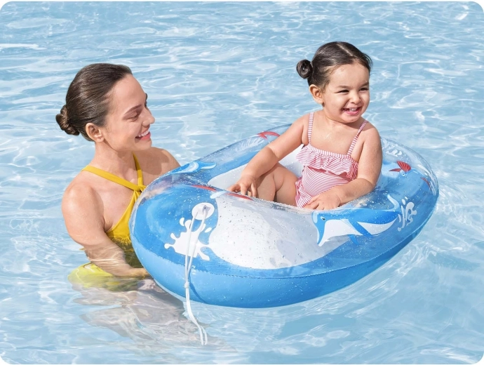 Az átgondolt részletek, mint a felfújható, bordázott fenék a kényelmes üléshez és a húzózsinór az egyszerű húzáshoz vagy vezetéshez a víz felszínén, növelik a komfortot és az irányíthatóságot. A delfinekkel és halacskákkal díszített színes grafika minden gyereket lenyűgöz, és fokozza a vízi játék örömét.