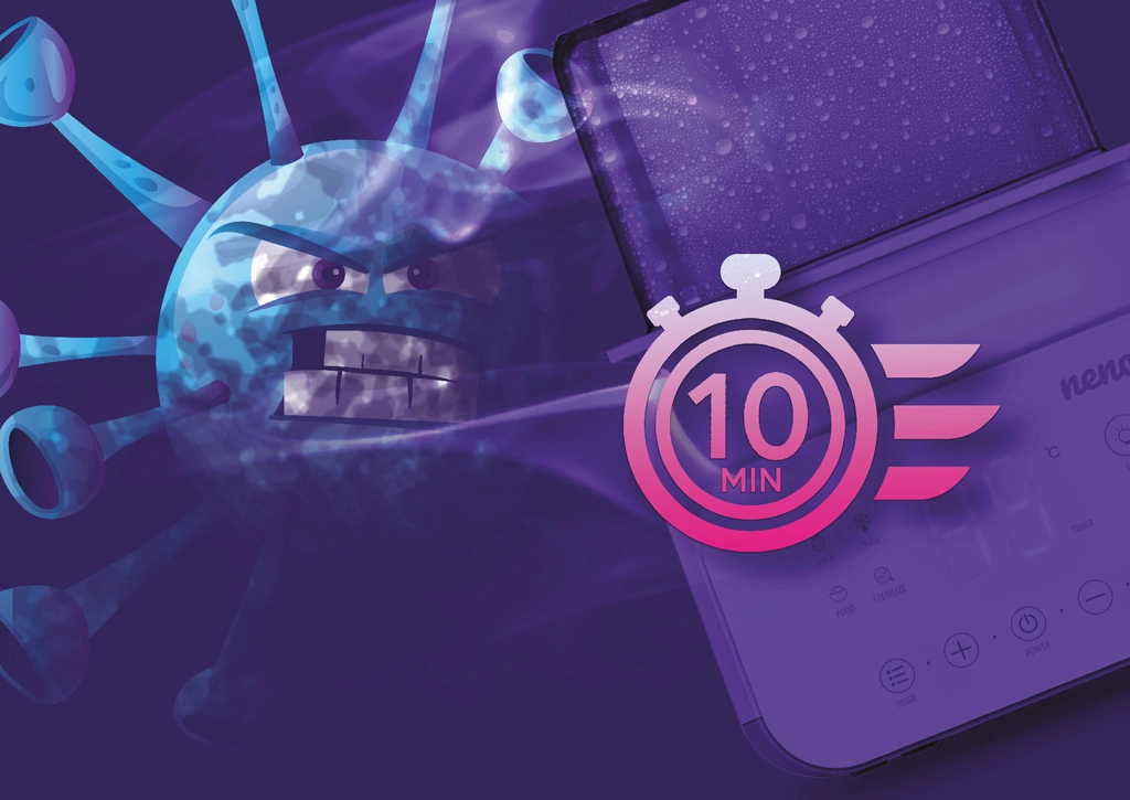 A nagy teljesítményű sterilizáló üzemmód segít higiénikusan tisztán tartani az üvegeket, cumikat, rágókákat és kiegészítőket. Néhány perc alatt eltávolítja a nem kívánt mikroorganizmusokat, így mindent biztonságosan használhatsz.