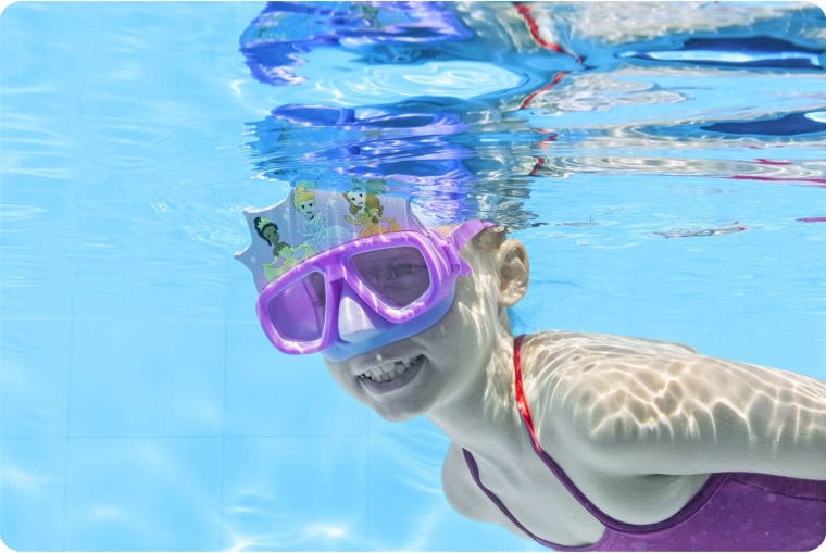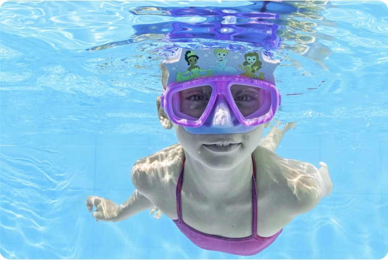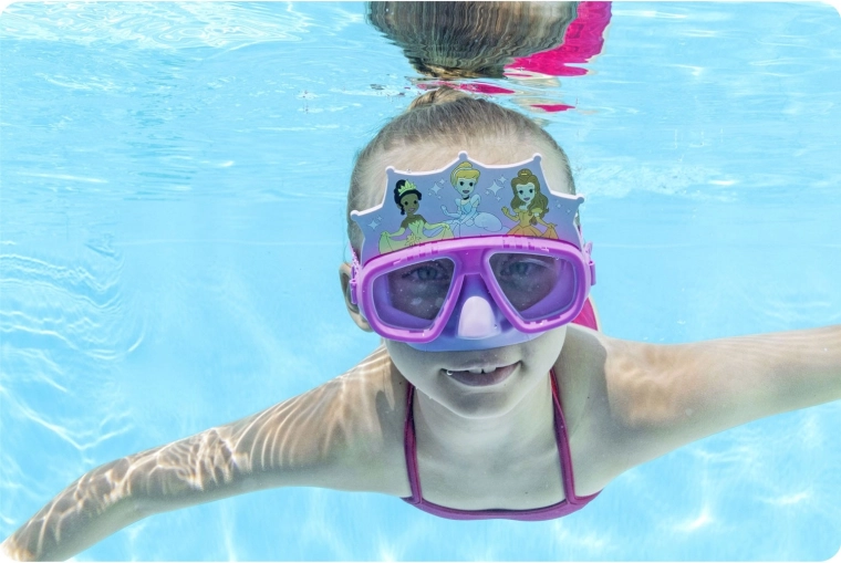 A Bestway PRINCESS mintás gyerek búvármaszk széles látómezőt, kényelmes, szivárgásmentes illeszkedést és állítható szilikonpántot kínál a biztos rögzítéshez. A polikarbonát lencsék UV védelemmel tiszta kilátást nyújtanak a víz alatt és óvják a szemeket. 3 éves kortól ideális medencés játékhoz és első sznorkelezéshez.