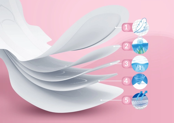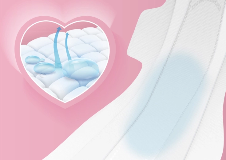 Az ergonomikus forma és a négy szárny révén járás, fekvés és alvás közben is a helyükön maradnak. A légáteresztő mikropórusos fólia segíti a levegőáramlást, csökkenti az irritációt, és a szagsemlegesítő technológiával együtt magabiztos frissességet nyújt.