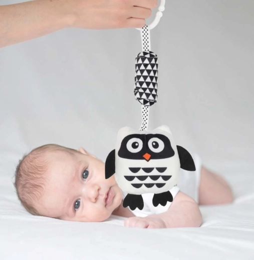 Ez a kontrasztos, bagoly alakú akasztós játék az újszülöttek igényeit szem előtt tartva készült. A fekete és fehér színek magas kontrasztja felkelti a babák figyelmét, és támogatja a korai látásfejlődést. A puha, kellemes tapintású anyagok és a biztonságos kivitelezés kényelmes és biztonságos felfedezést biztosítanak.