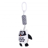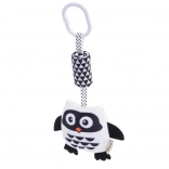 A függő játék bagoly formájú és puha, kellemes anyagból készült, a legkisebb gyermekek igényeihez igazítva. A csipesz biztosítja a könnyű rögzítést a babakocsira, kiságyra vagy hordozóra. A különféle felületi textúrák révén a játék érintésére ösztönzi a gyerekeket. A csörgő és rezgő elemek hallásra ösztönöznek, míg a kontrasztos árnyalatok alkalmazása látásra serkent. A fekete-fehér dizájn a legjobb választás a csecsemőknek, akiknél még nem fejlődött ki teljesen a látás.