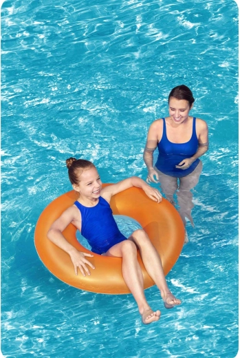 A BESTWAY 91 cm-es felfújható úszógumi ideális társ medencéhez, tóhoz és tengerhez. Ragyogó nyári színe növeli a láthatóságot és a biztonságot, míg a tartós PVC anyag hosszú élettartamot biztosít még gyakori használat mellett is.