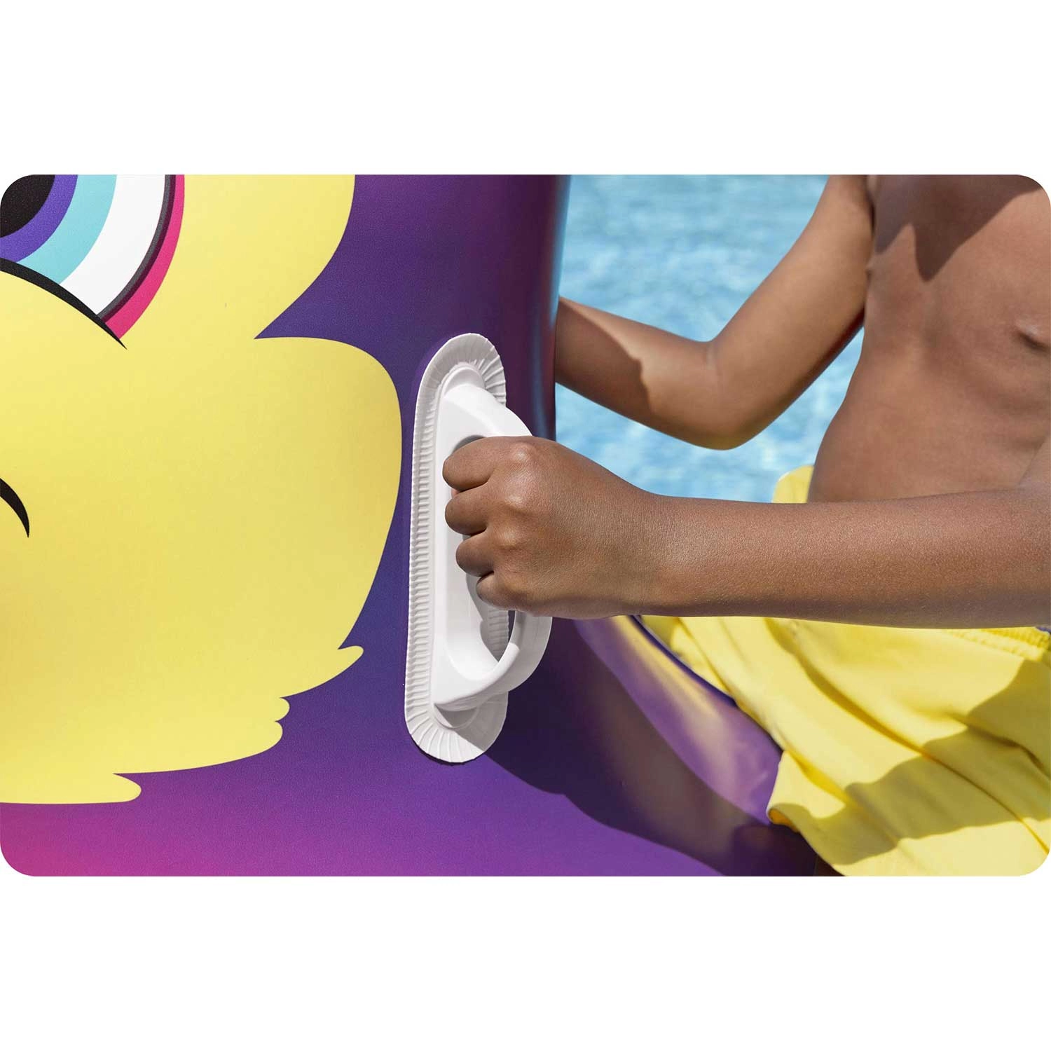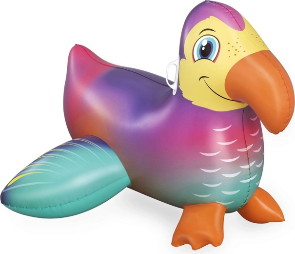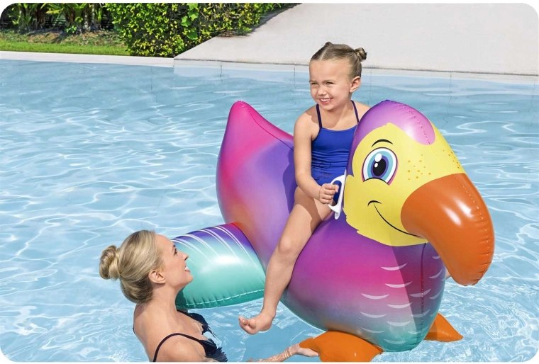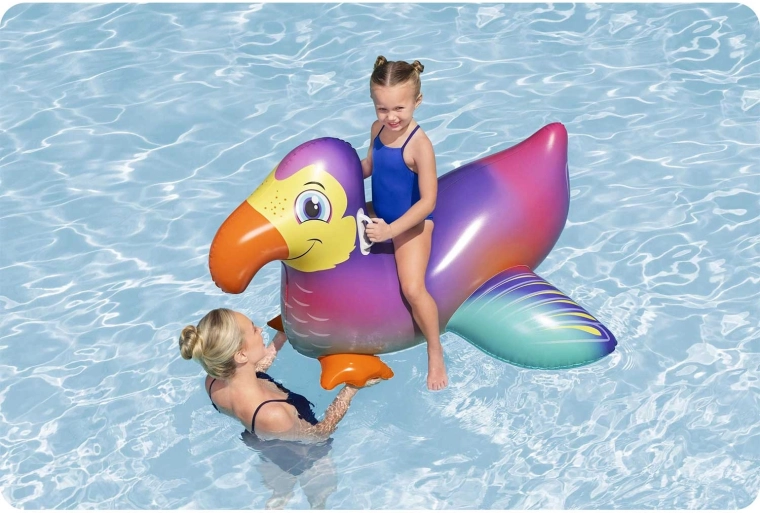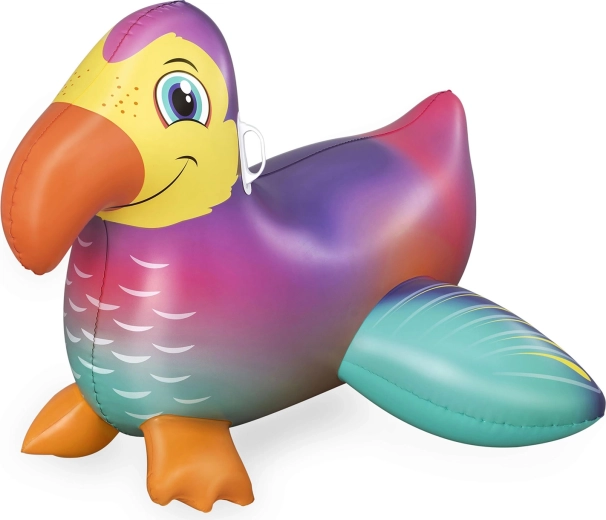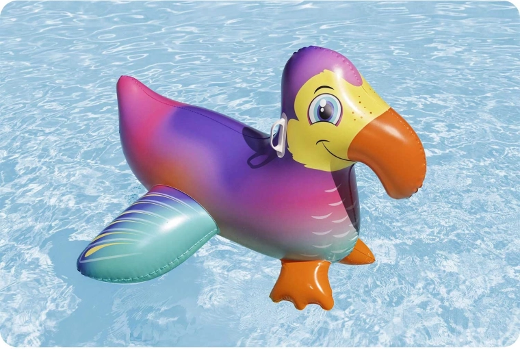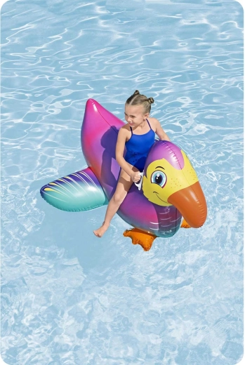 A Bestway felfújható tukán játékos és biztonságos társ 3 éves kortól a vízi mókához. Nagy teste és kiegyensúlyozott formája különlegesen stabil, miközben az erős fogantyúk megkönnyítik a kényelmes felülést és kapaszkodást. A színes dizájn a feltűnő csőrrel biztosan magára vonja a figyelmet minden nyaraláson.