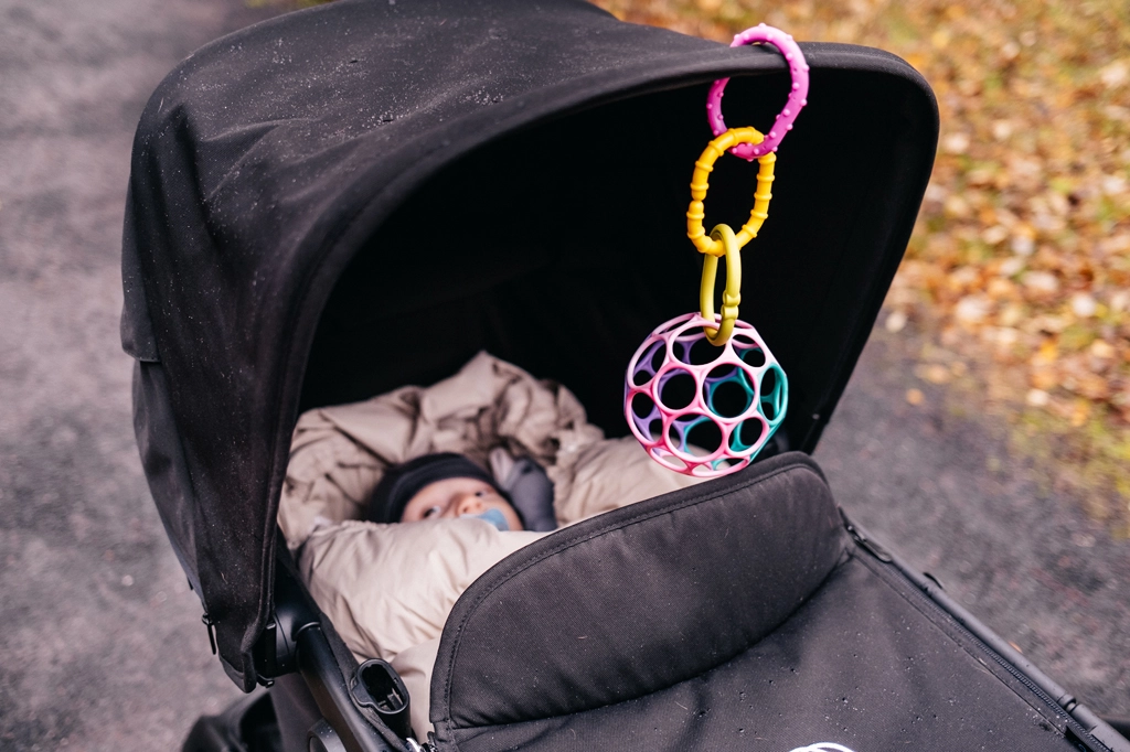 Tartós kivitelének és a biztosítókörökhöz való könnyű rögzíthetőségének köszönhetően a labda tökéletes babakocsiba vagy autósülésbe.