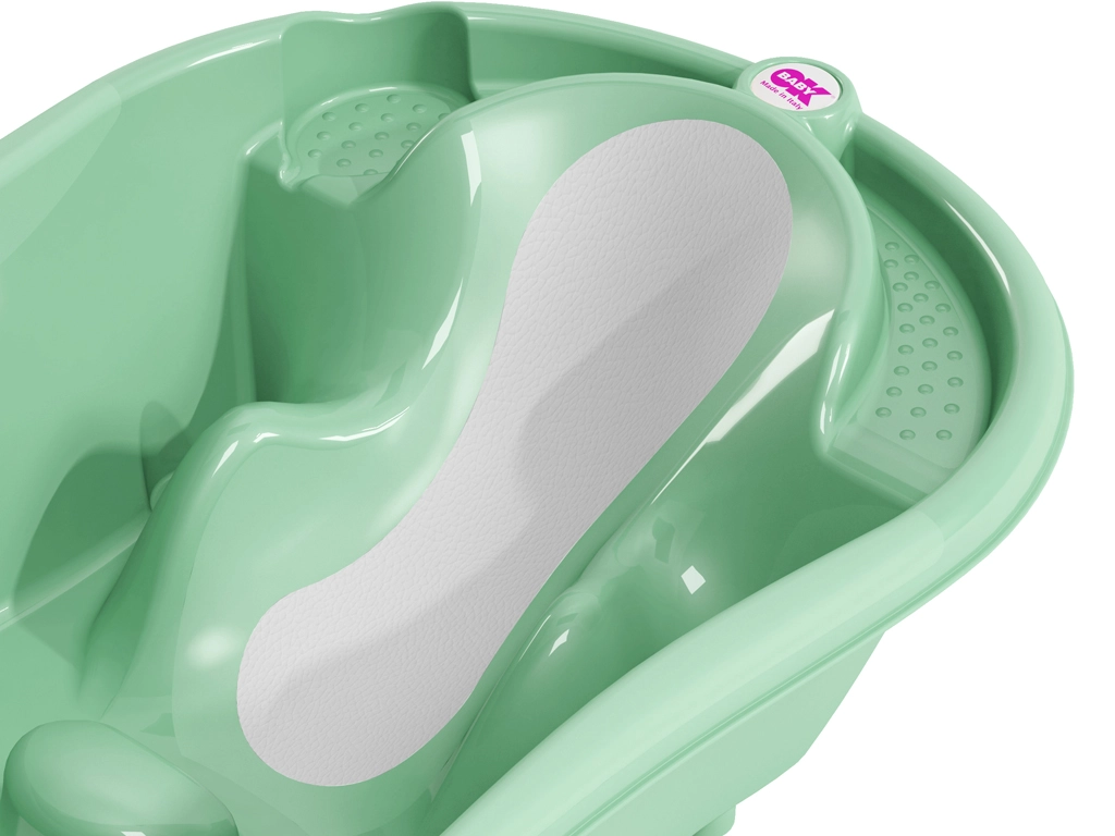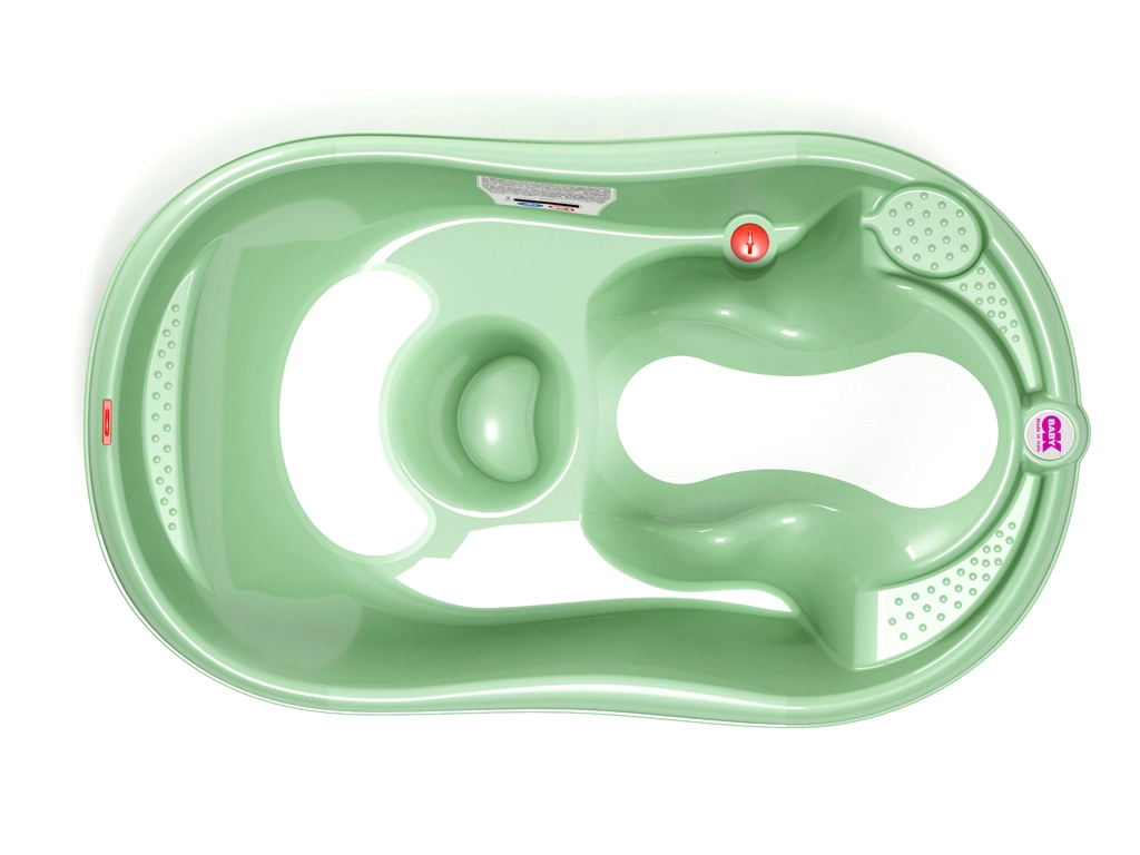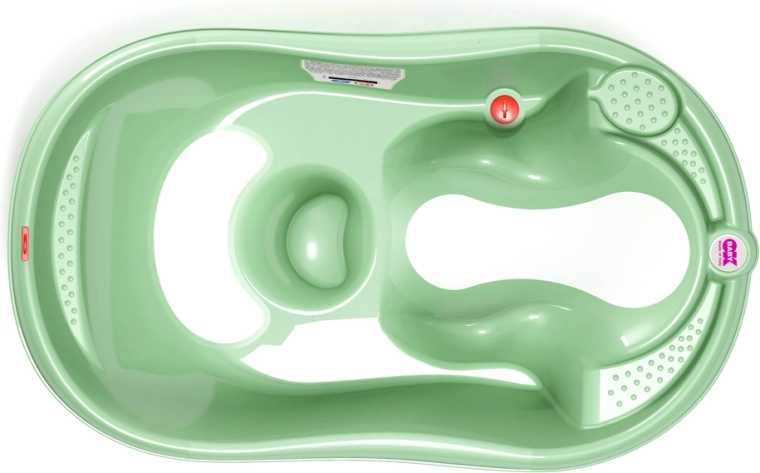Az ergonomikus OK BABY Onda Evolution babakád mentaszínben a fürdetéshez újszülött kortól kb. 12 hónapos korig maximális biztonságot és kényelmet kínál. A fekvő és ülő babának is megfelelő két pozíciónak, a csúszásgátló zónáknak és a vízhőmérséklet-ellenőrző termo csíknak köszönhetően minden fürdetés egyszerű és nyugodt lesz. A zárható leeresztőszelep megkönnyíti az ürítést és megakadályozza a víz véletlen elfolyását.