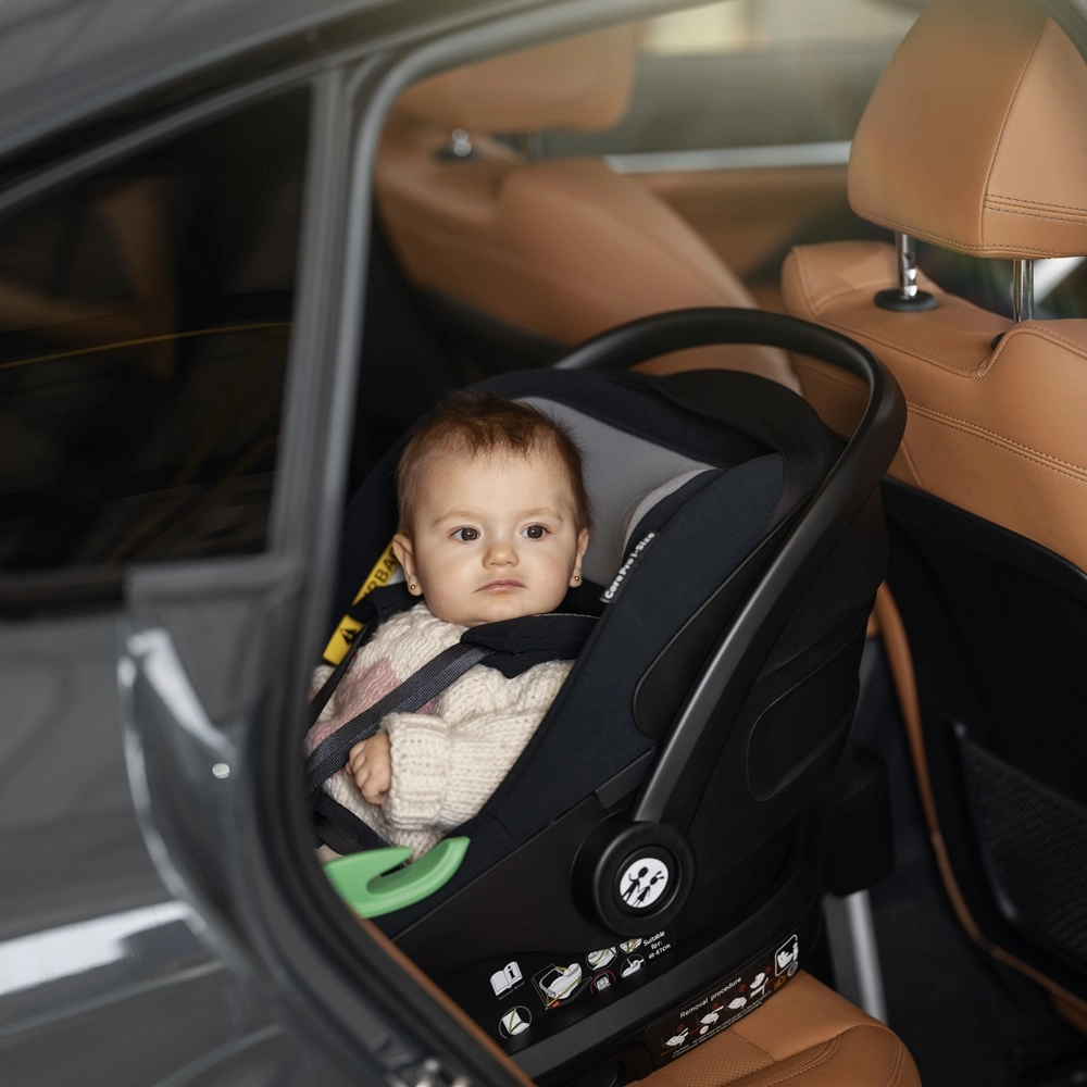 A beszerelés menetiránnyal szemben történik, akár az autó biztonsági övével, akár még egyszerűbben az ISOFIX bázissal és támasztólábbal. A csomag része a megfelelő bázis, amely gyors klik–in/klik–out fel- és lepattintást, valamint a helyes rögzítést jelző vizuális indikációt biztosít. Az ergonomikus, állítható hordfogantyúval az autósülés könnyen vihető az autó és az otthon között.