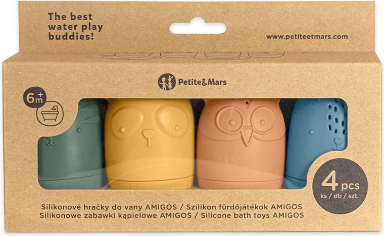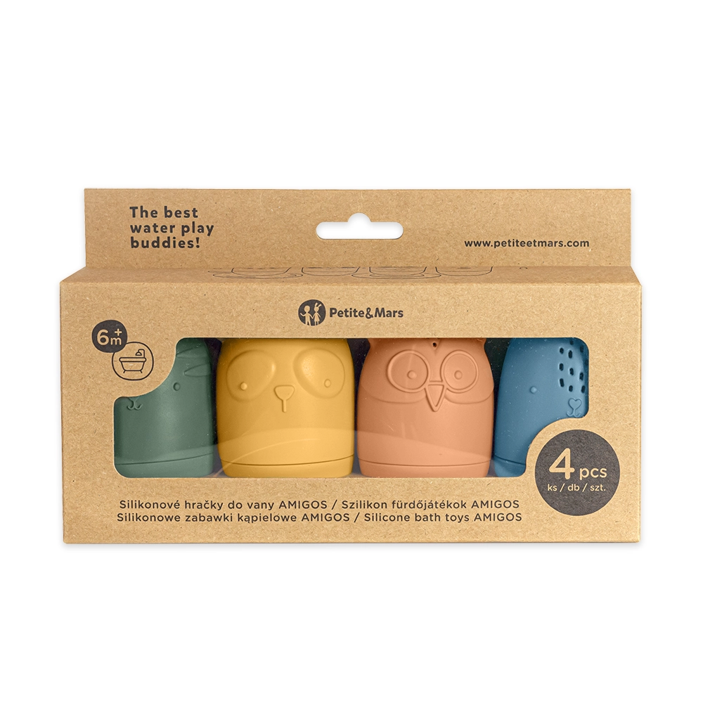 A Petite&Mars Amigos készlet biztonságos és kreatív vízijátékot kínál 6 hónapos kortól. Minden figura vízbe merítve megtelik, és a nyílásokon keresztül vidáman permetez. A puha szilikon kellemes fogású, a nyomkodás erősíti a markolatot és a szem–kéz koordinációt.