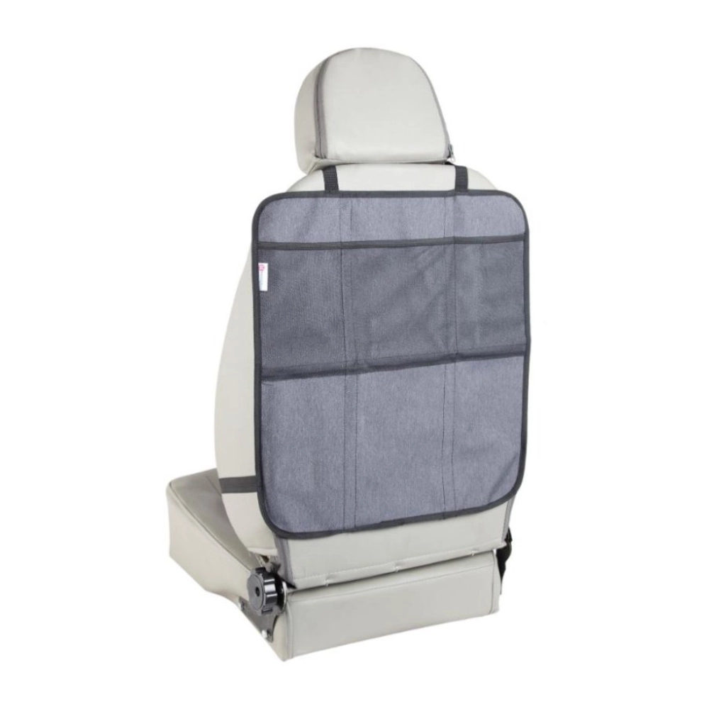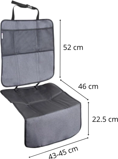 A termék két különálló részre bontható — az alsó elem a gyerekülés alatt fedi az ülőlapot és az ülés élét, míg a felső elem rúgásgátló háttámlavédőként működik tárolórekeszekkel. A telepítés pillanatok kérdése az állítható pántoknak és a fejtámlához illő univerzális rögzítésnek köszönhetően.