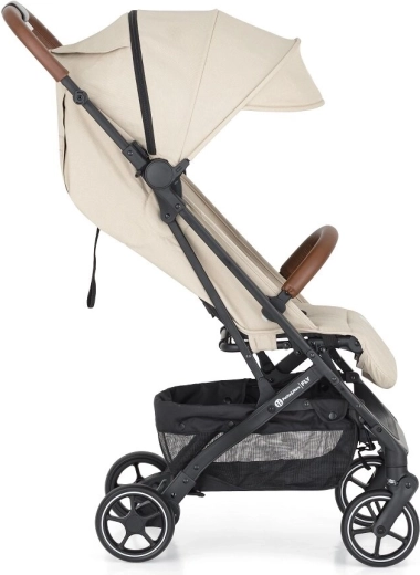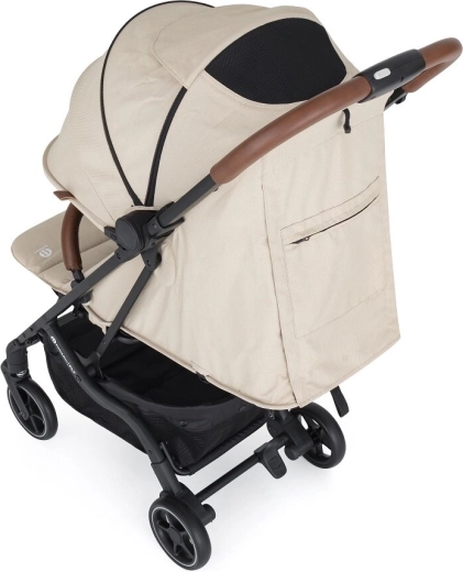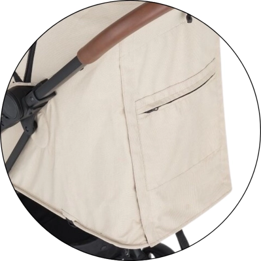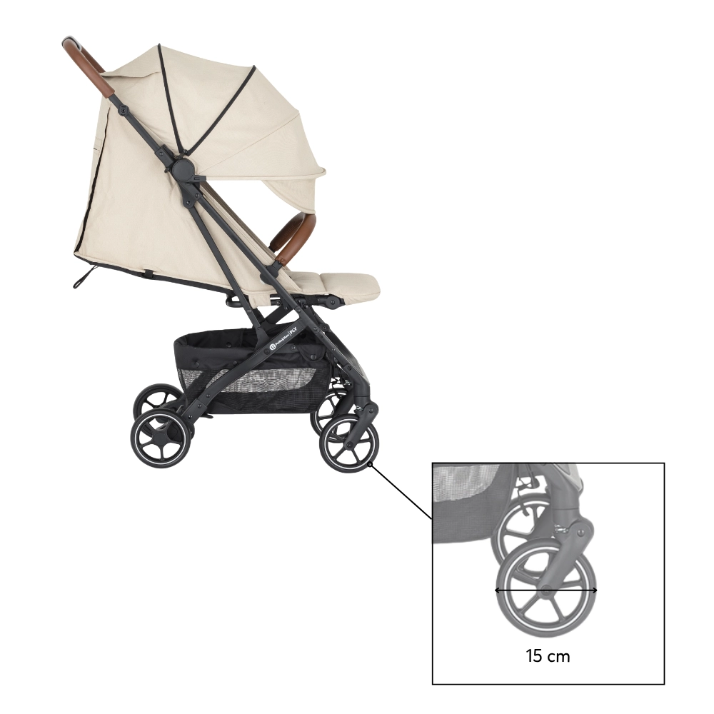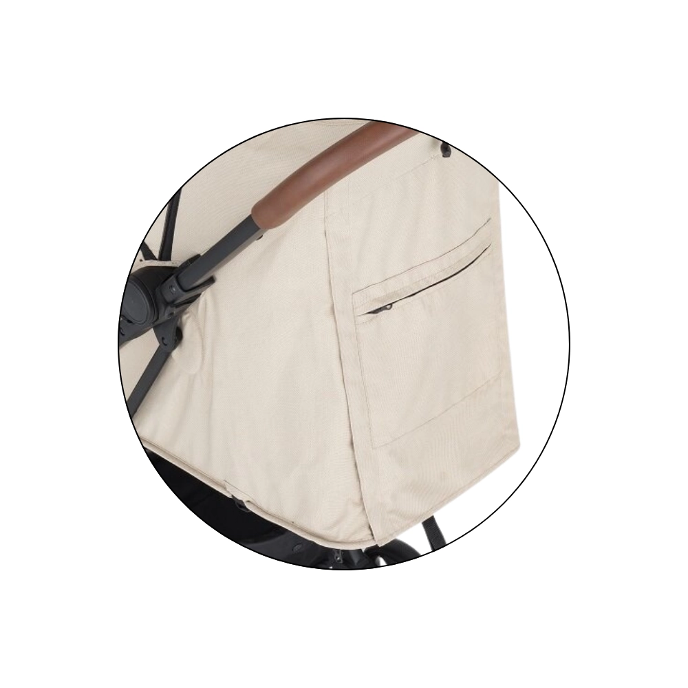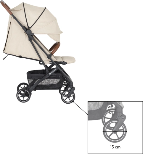 A tágas, meghosszabbítható kupola napellenzővel hatékony védelmet nyújt a nap és a szél ellen. Melegben értékelni fogod a hálós betekintőnyílást a kupolán és a nagy hátsó szellőzőhálót a huzat feltekerése után. A szülőknek praktikus az levehető karfa a gyors hozzáféréshez, az ökobőr tolókar a kellemes fogásért, a praktikus hátsó zseb apróságoknak és a tágas bevásárlókosár. A csomagban palacktartó is található.