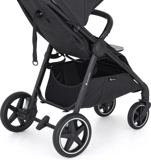 A nagy hátsó kerekek és a rögzíthető, forgó első kerekek sima haladást biztosítanak városi járdákon és könnyű terepen – defekt kockázata nélkül.