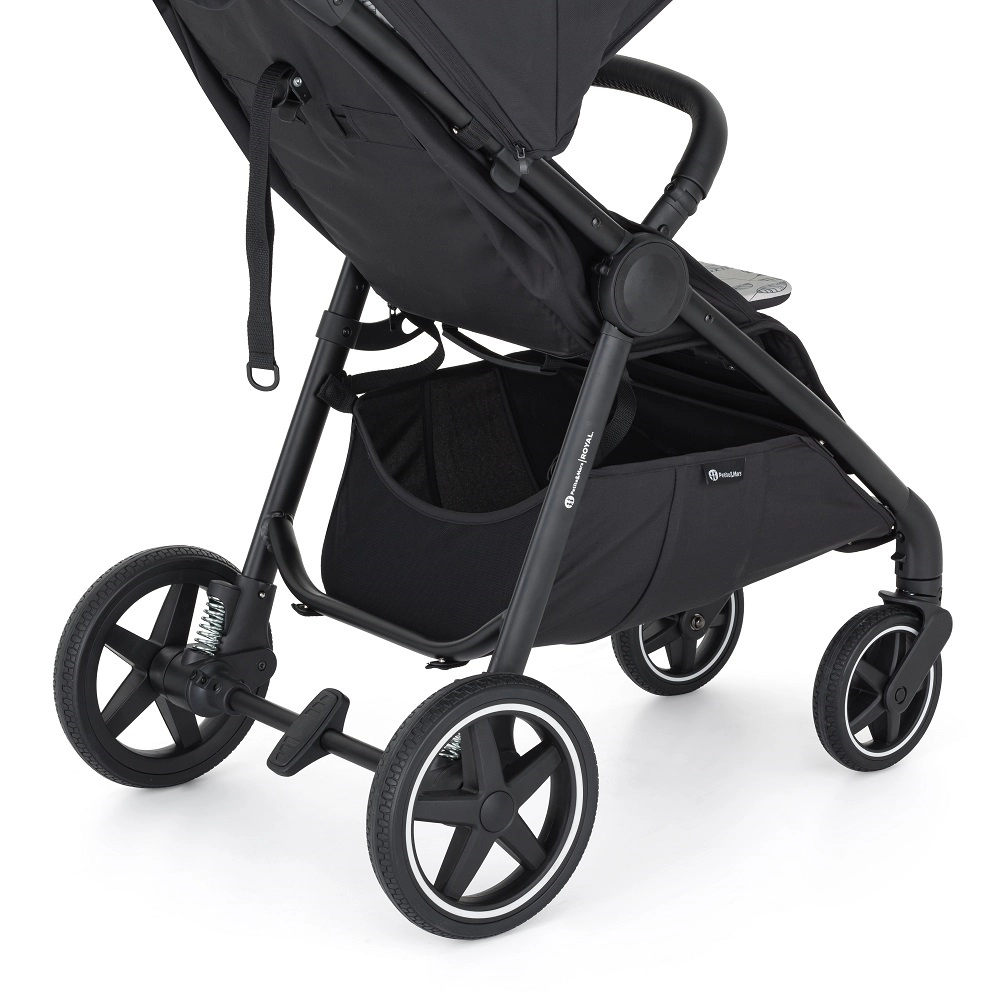 A stílusos fehér peremmel ellátott, teljesen gumírozott kerekek és a rugózás stabil haladást nyújtanak egyenetlenségeken is, és nem fenyegeti őket a defekt. A masszív alumínium váz, a központi fék és a minőségi kerékfelfogatások biztonságot garantálnak, míg a nagy bevásárlókosár és a pelenkázótáska megkönnyíti a mindennapi sétákat. A babakocsi együtt nő a családdal – a kupola könnyen cserélhető más színre (kompatibilis a Royal2/Royal3 modellekkel).