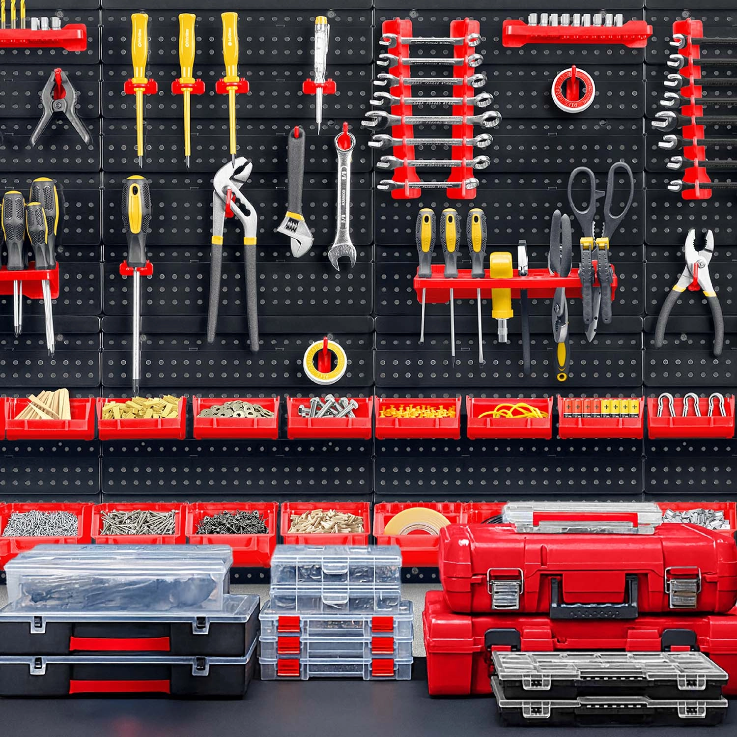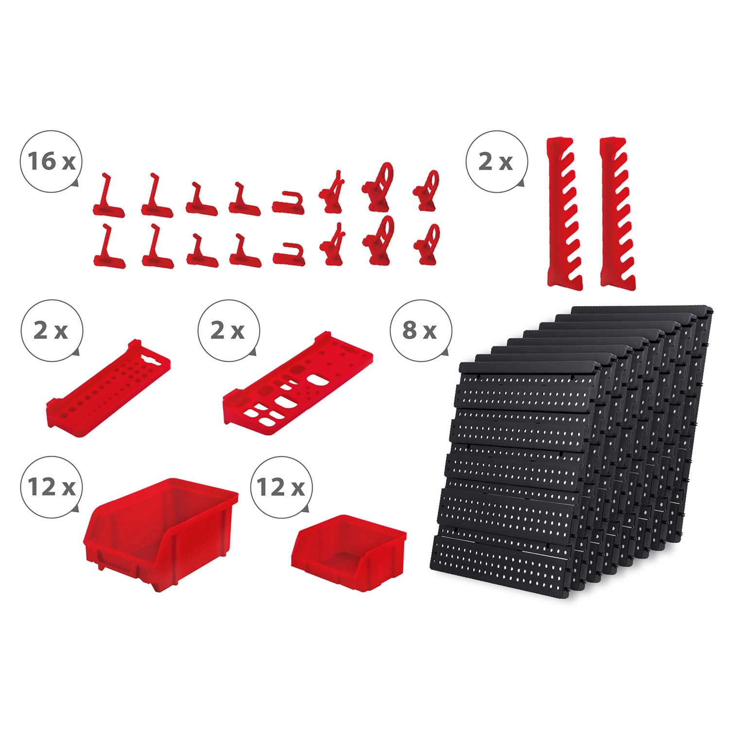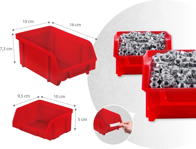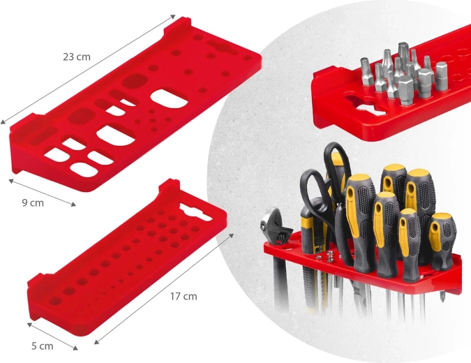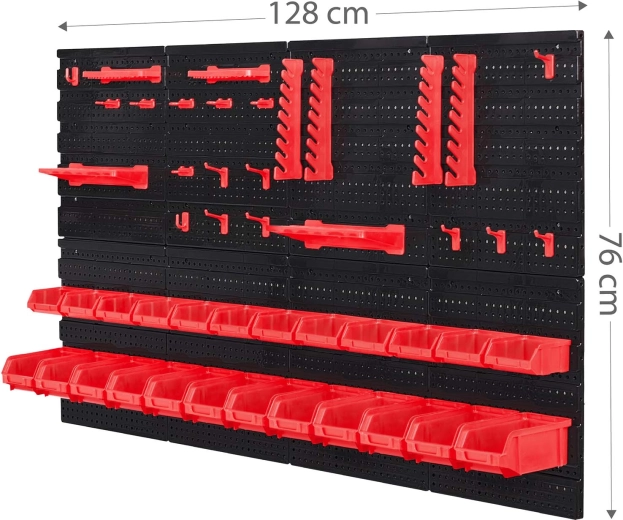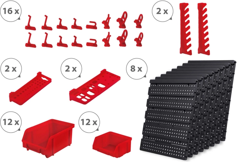 12 kicsi és 12 nagy tárolódoboz csavarokhoz és facsavarokhoz, 16 horog és tartó, plusz 2 kulcstartó – egyszerű válogatás és gyors hozzáférés.