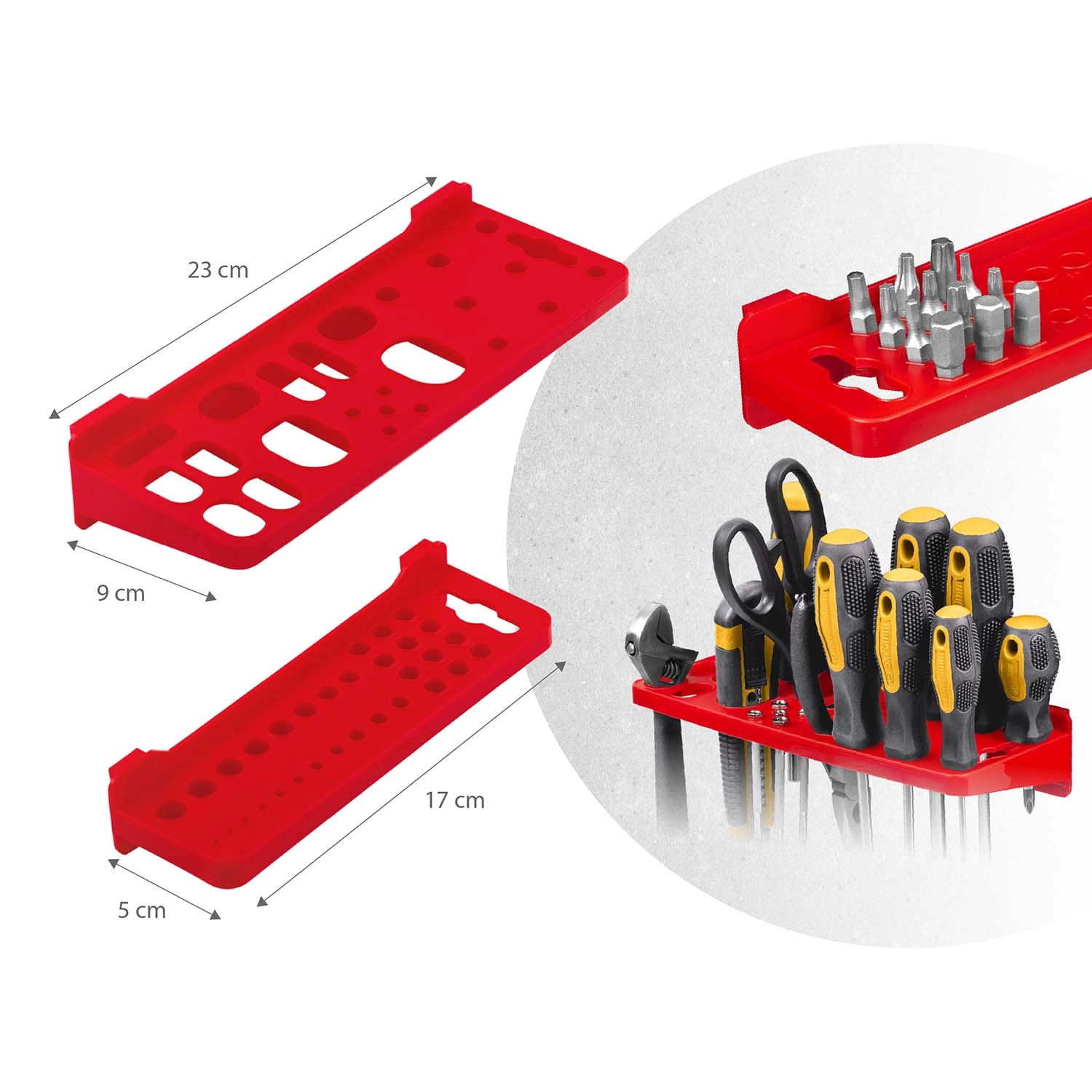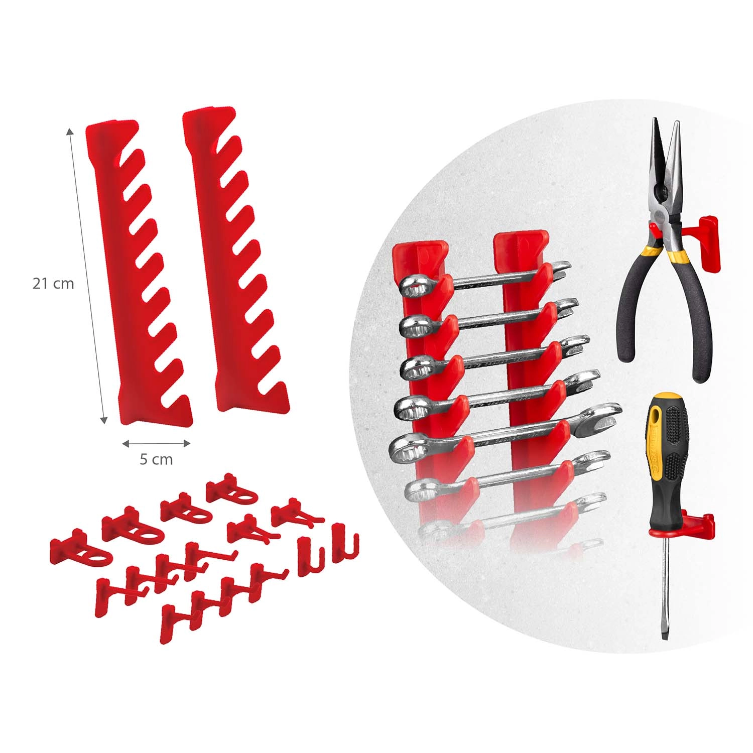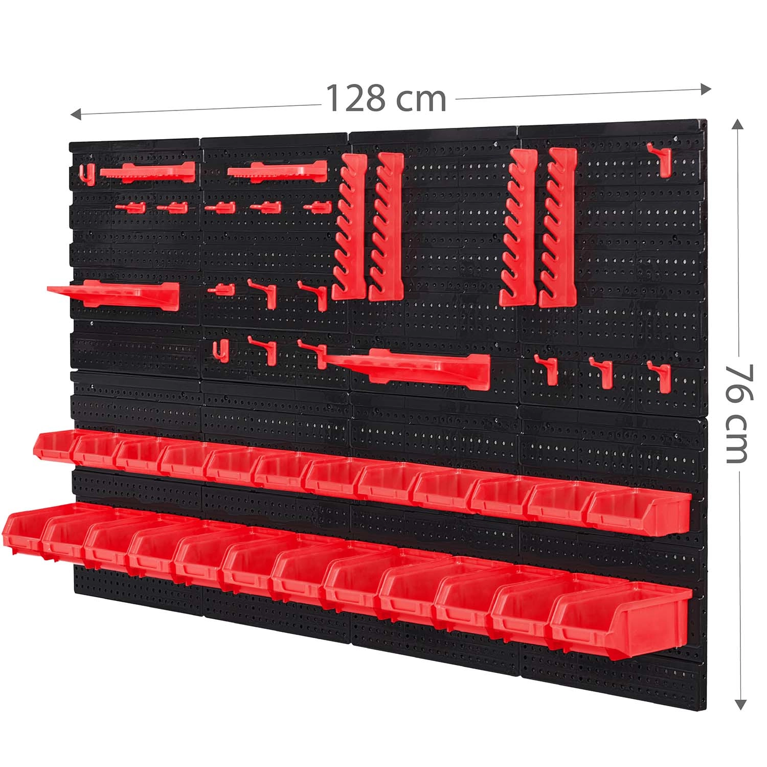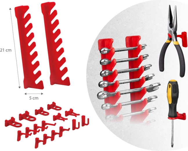 12 kicsi és 12 nagy tárolódoboz csavarokhoz és facsavarokhoz, 16 horog és tartó, plusz 2 kulcstartó – egyszerű válogatás és gyors hozzáférés.