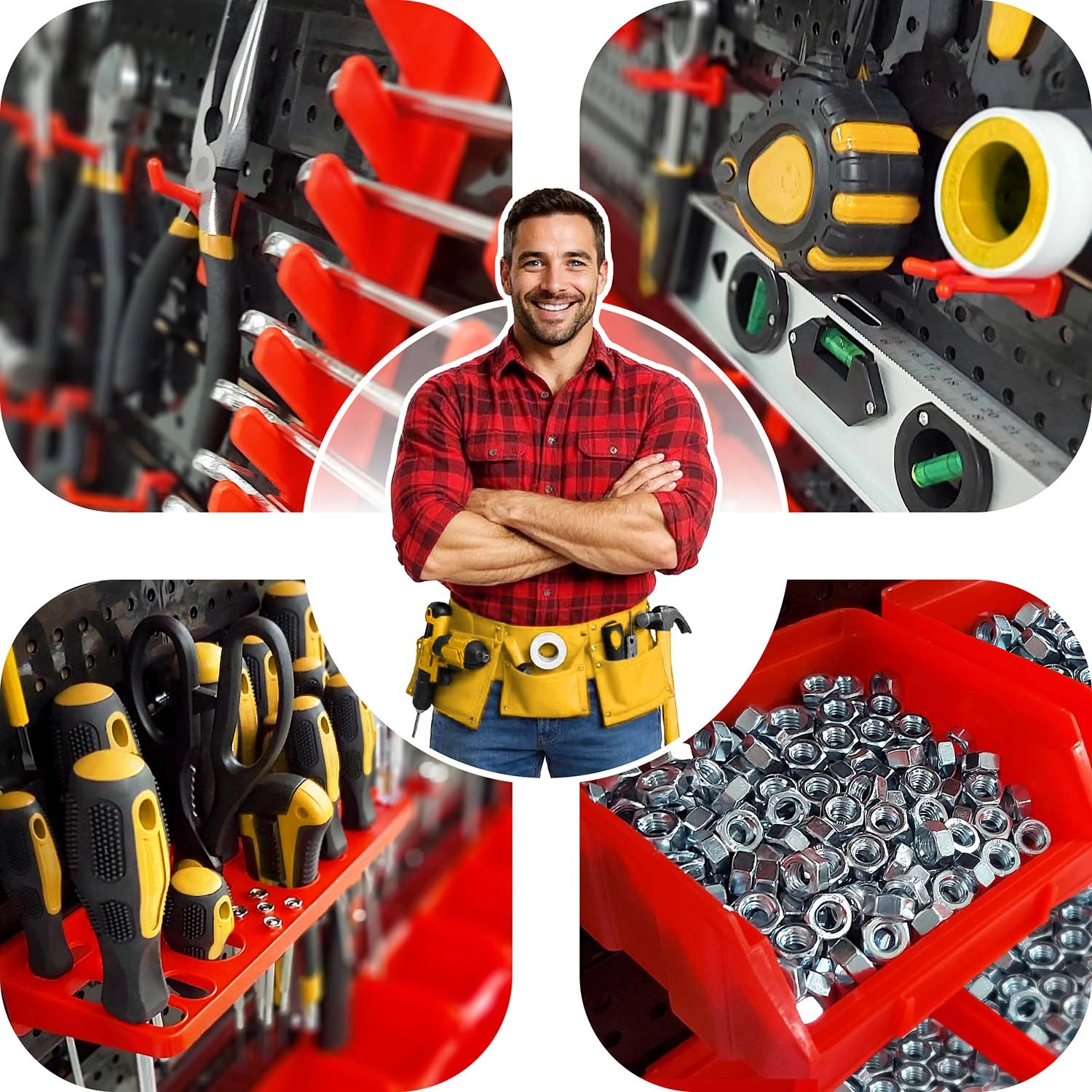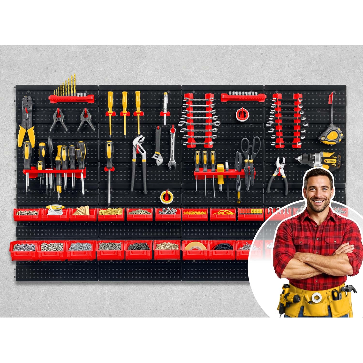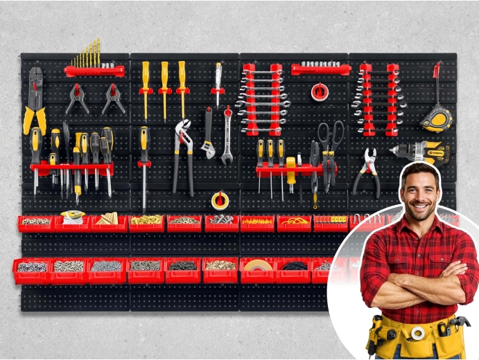 A HUMBERG moduláris pegboard panelszett bármely teret tökéletesen szervezett munkaállomássá alakít. A sokoldalú horgok és tartók, a kétféle méretű tárolódobozok és a praktikus polcok kombinációja gondoskodik róla, hogy a csavarhúzók, fogók, bitek, fúrók és kötőelemek mindig kéznél legyenek. A masszív, perforált panelek bírják a mindennapos használatot, és az elemek okos elrendezésének köszönhetően a táblát könnyedén a saját szokásaihoz igazíthatja.