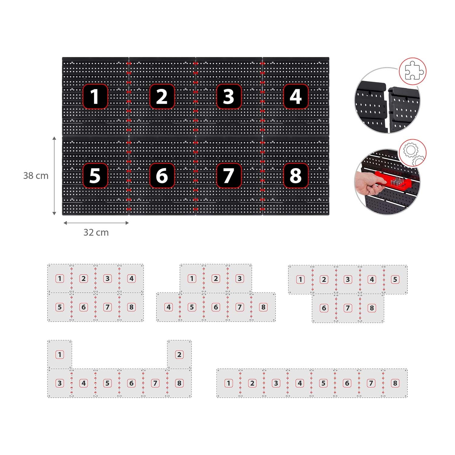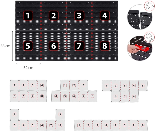 A készlet tartalma: 6 moduláris panel, 12 kis tárolódoboz (9,5 × 10 × 5 cm), 12 nagy tárolódoboz (16 × 10 × 7,3 cm), 2 db 23 × 9 cm-es polc, 2 db 17 × 5 cm-es polc, 16 tartó és horog, 2 kulcstartó, valamint szerelőtiplik különböző felületekhez (beton, tégla, fa, lemez). A szerelés gyors és intuitív – az elemeket egyszerűen bepattintja a perforációba, és bármikor átrendezheti.