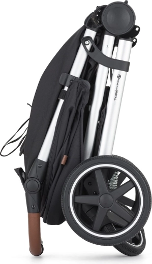 Barna ökobőr tolókar és karfa, nagy kosár, lábzsák és pelenkázótáska a csomagban. Az egykezes, befelé csukódó mechanizmus tisztán tartja a huzatokat.