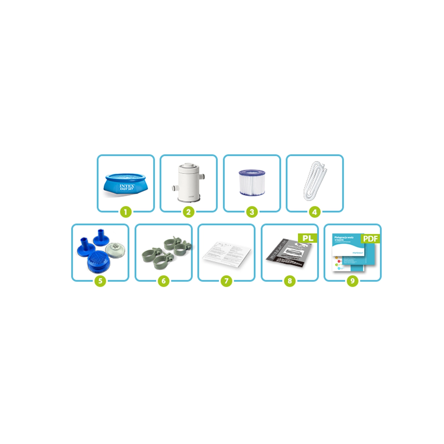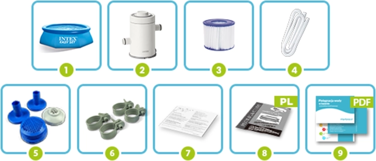 - medence, szűrőszivattyú, H típusú szűrőbetét, tömlők, szűrőkosarak, bilincsek, javítótapasz, útmutató