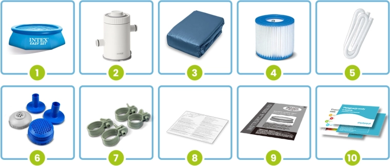 - Szűrőszivattyú, takaróponyva, H szűrő, tömlők, sziták, bilincsek, javítófolt, használati útmutató