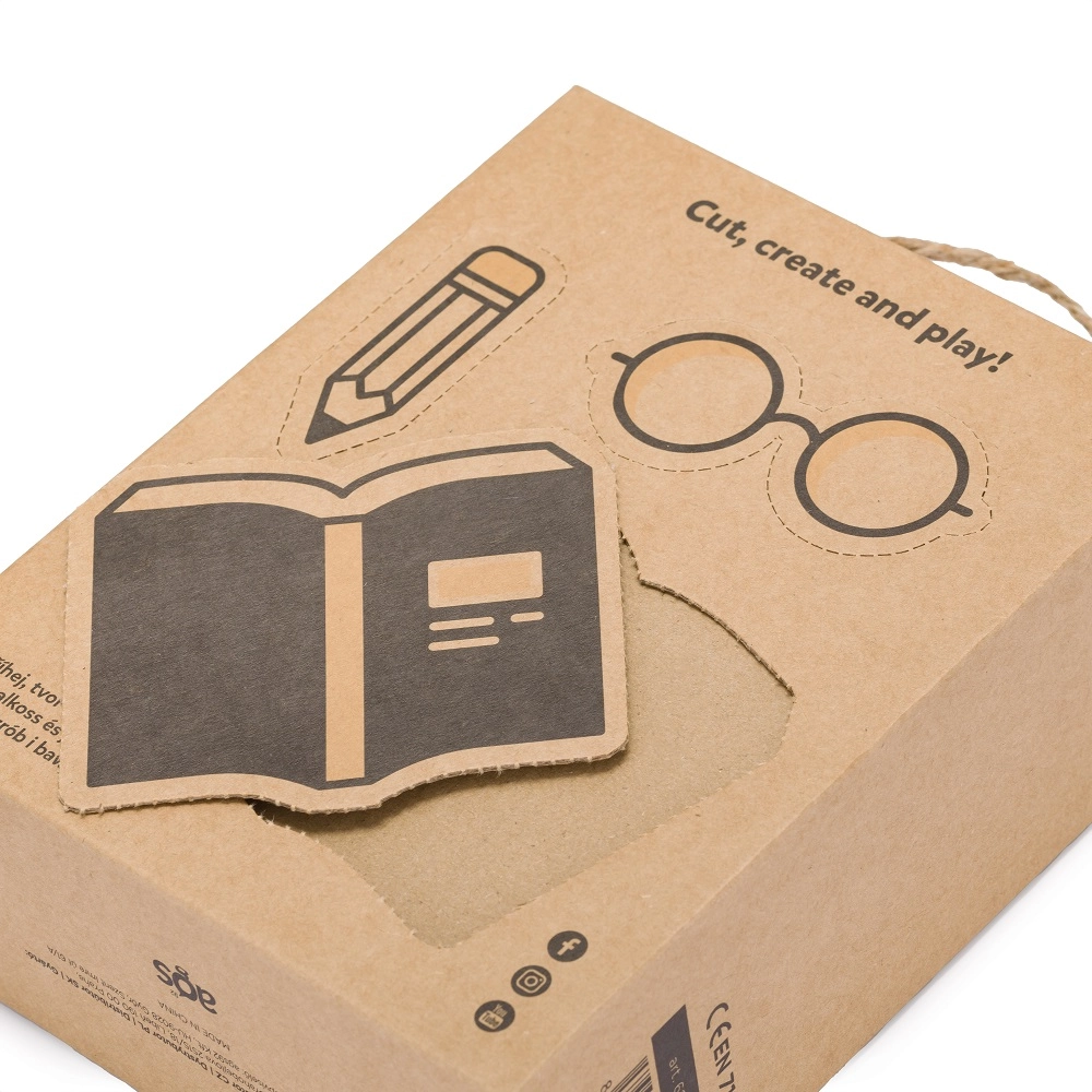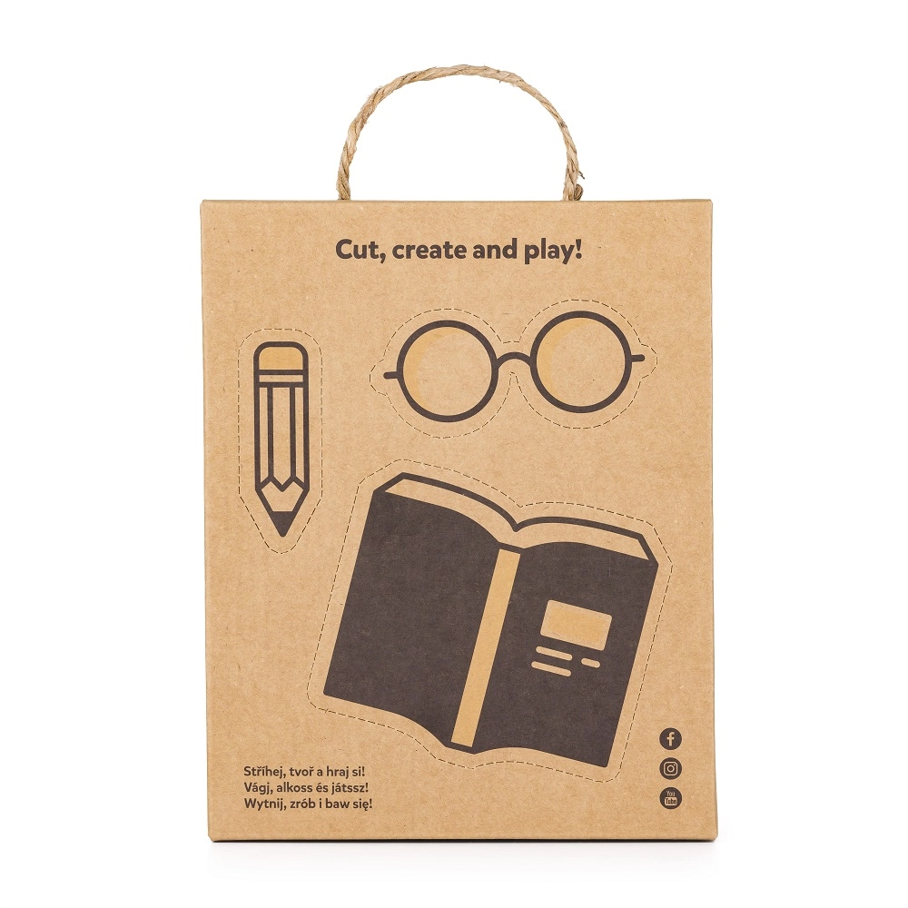 A kraft papírból készült doboz illusztrált, kipattintható kiegészítőket tartalmaz (könyv, ceruza…), amelyek bővítik a játékszcenáriókat és serkentik a fantáziát.