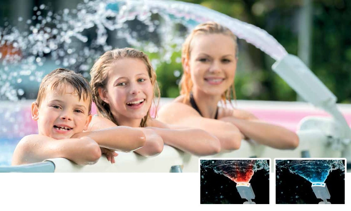 - LED vízköpő / vízesés felfújható/föld feletti medencékhez