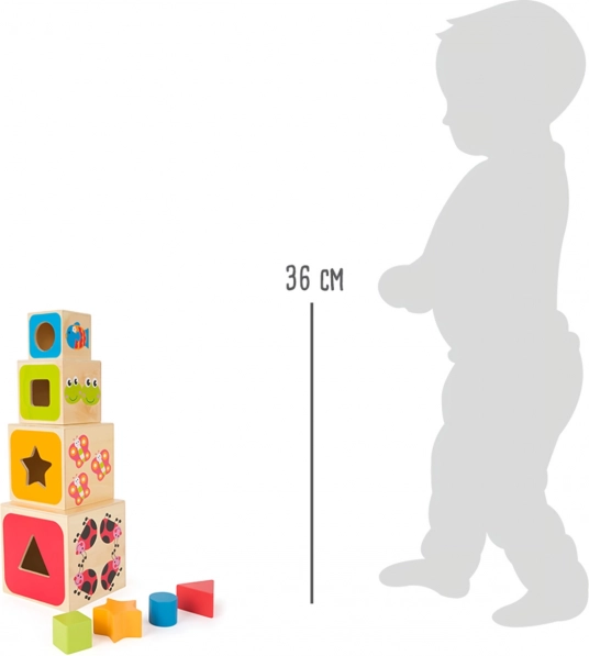 Minden kockát vidám állatmotívumok és élénk színek díszítenek, amelyek felfedezésre ösztönöznek. A pontos nyílások türelemre és összpontosításra nevelnek, a toronyépítés pedig fejleszti a kéz stabilitását és a térbeli képzelőerőt. A minőségi faanyag kellemes tapintású és ellenálló a mindennapos játék során.