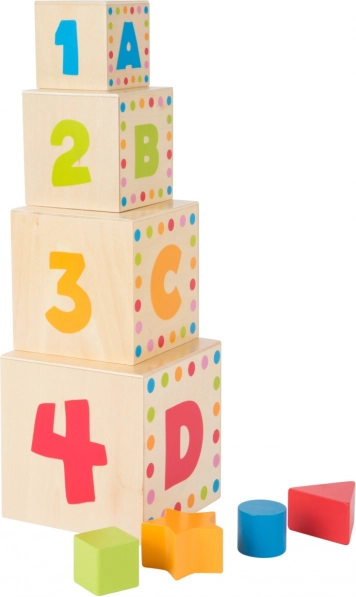 Az ABC small foot fa bedobós kockák ideális didaktikus játék az első tanulási élményekhez. A gyerekek a megfelelő formákat a hozzájuk illő nyílásokba dobják, egymásra rakják a kockákat, és a nyomatok segítségével ismerkednek a betűkkel és számokkal. Játékos módon gyakorolják a formák és színek felismerését, a számolást és az ábécét.