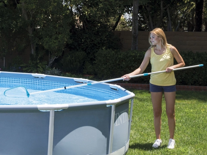 Ezzel az univerzális INTEX medencetisztító készlettel mindent megkap a mindennapi karbantartáshoz. A 239 cm-es hatótávú teleszkópos alumínium rúd segítségével kényelmesen megtisztítható a felszín és az aljzat is, legyen szó levelekről, rovarokról vagy lerakódott szennyeződésekről. A porszívó a szokásos kerti tömlőhöz csatlakozik, és a víz áramlását használja a szennyeződések beszívására a mellékelt zsákba.