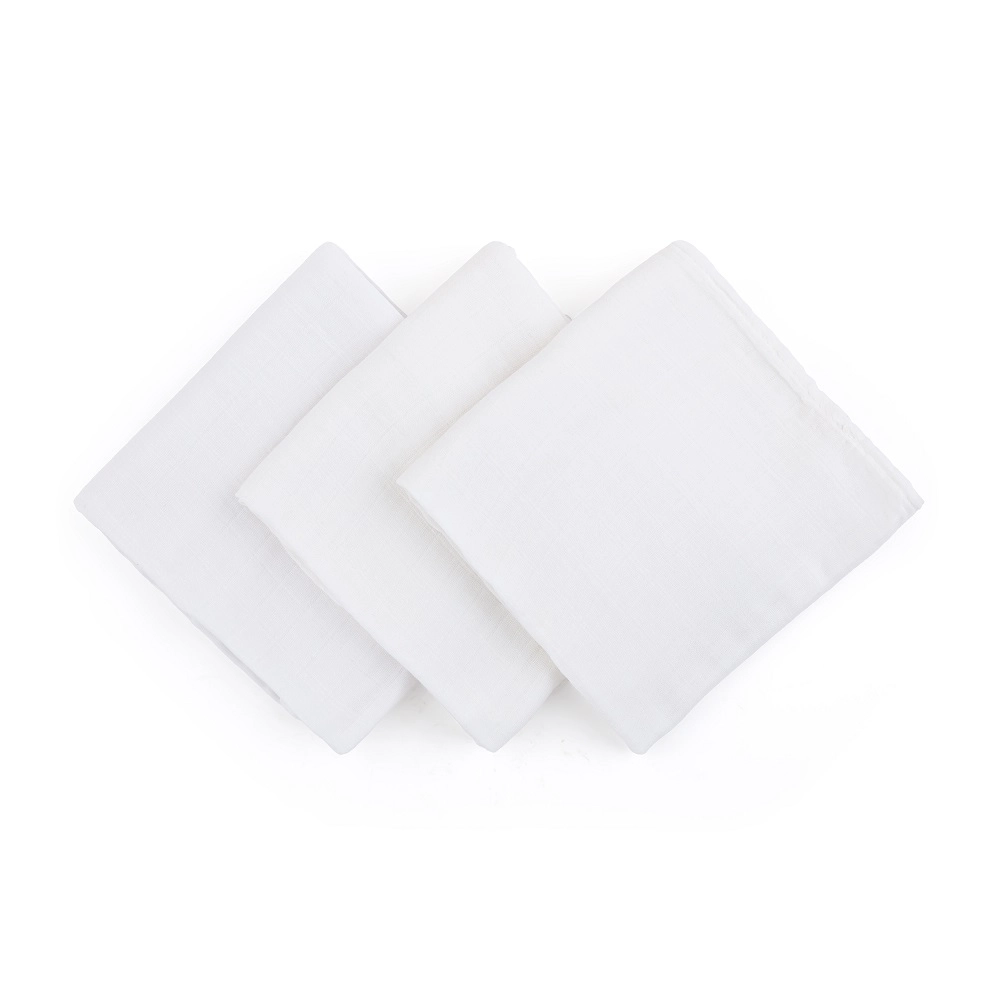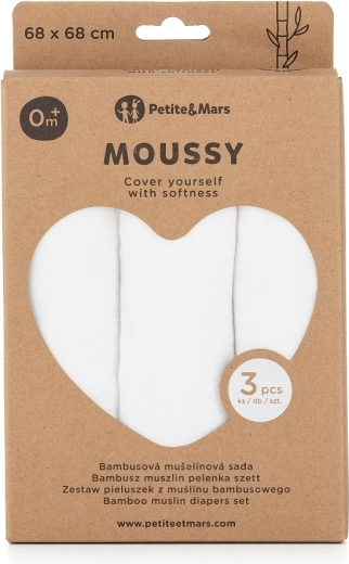 A PETITE&MARS Moussy Total White szett három pihe-puha muszlin pelenkát tartalmaz 70% bambuszból és 30% pamutból. Enyhe, légies szövése kíméletes még az újszülöttek legérzékenyebb bőréhez is, és kiválóan nedvszívó. Otthon és útközben egyaránt hasznát veszi – kéztörlőként, ölelő törölközőként, alátétként, előkeként vagy büfiztető pelenkaként.
