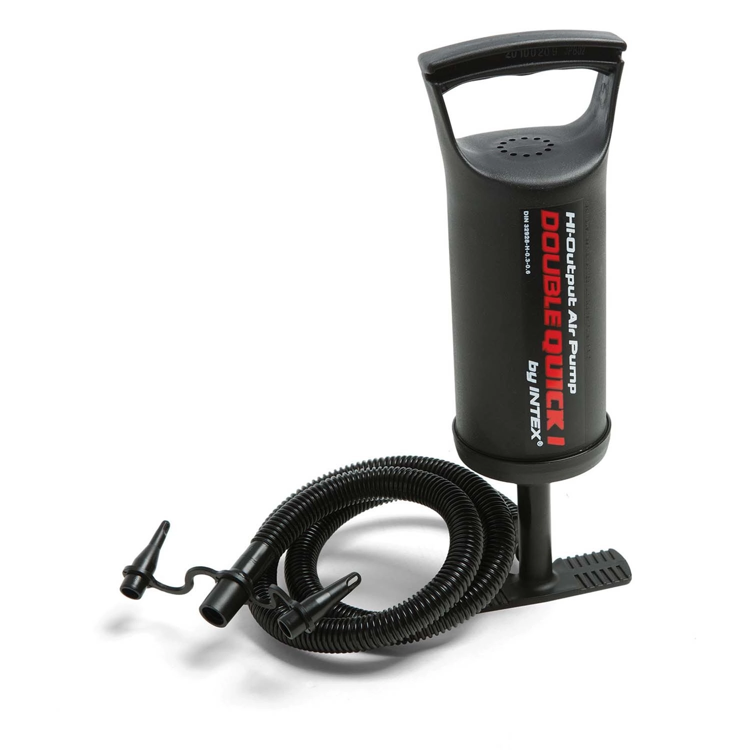 A csomagban található INTEX Double Quick kézi dugattyús pumpa többféle csatlakozóval a könnyű felfújáshoz és leeresztéshez.