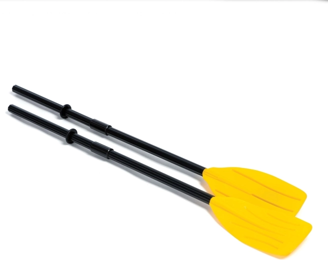 A szett része a könnyű műanyag evezőpár és a nagy teljesítményű Intex Double Quick II kézipumpa a gyors felfújáshoz.