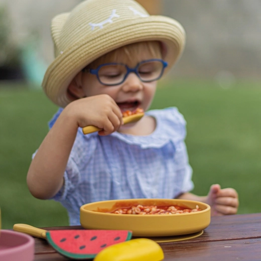 A masszív tapadókorong az asztalhoz vagy az etetőszék tálcájához rögzíti a tányért, így étkezés közben nem csúszik és nem borul fel. Ideális az önálló evés első lépéseihez.