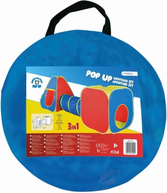 A szórakoztató 3 az 1-ben pop-up sátras szett játszótérré változtatja a szobát vagy a kertet. Tartalmaz egy kocka sátrat, egy alagutat és egy pop-up sátrat, melyek együtt és külön is használhatók. A villámgyors, erőfeszítés nélküli felállítás, a könnyű szerkezet és az egyszerű tárolás kényelmes játékot biztosít otthon és a szabadban is.