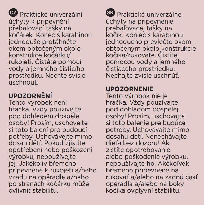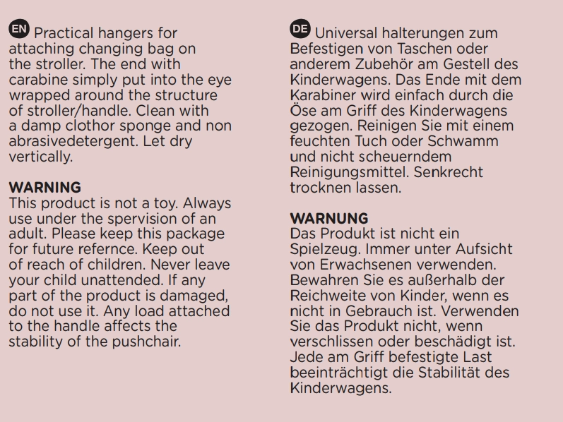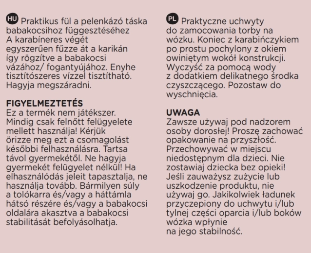Ne terhelje túl a babakocsi fogantyúját; a felfüggesztett teher befolyásolhatja a stabilitást. A termék nem játék. Csak felnőtt felügyelete mellett használja. Kopás vagy sérülés esetén ne használja.