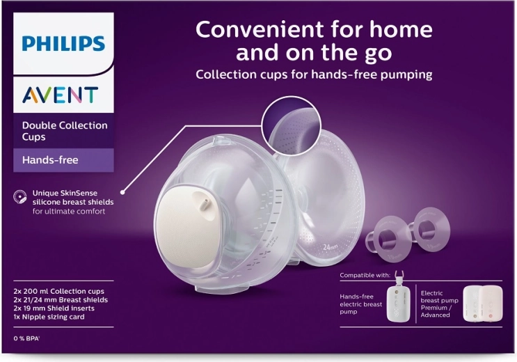 Tedd kényelmesebbé a szoptatást a PHILIPS AVENT hands-free gyűjtőtartályaival. A két ultrakönnyű tartálynak és a SkinSense szilikon mellpajzsoknak köszönhetően fizikai szabadságot nyersz fejés közben, hatékony tejáramlást érsz el, amely a baba ritmusát utánozza, valamint könnyű tisztítást és összeszerelést. A teljesen átlátszó kialakítás lehetővé teszi a tejáramlás valós idejű követését, és a mellékelt pajzsoknak és betéteknek köszönhetően megtalálhatod az ideális méretet.