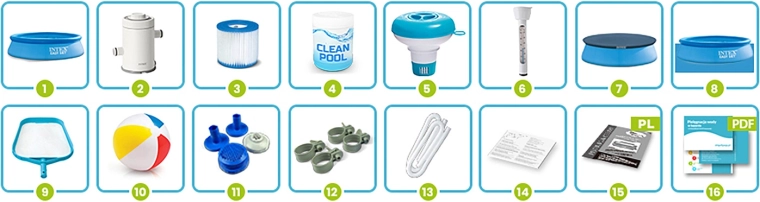 - Medence, szűrőszivattyú, H szűrő, multitabletták, vegyszeradagoló hőmérővel, takaró, alátét, háló, tömlők és bilincsek, szívókosarak, strandlabda, útmutató, javítófolt