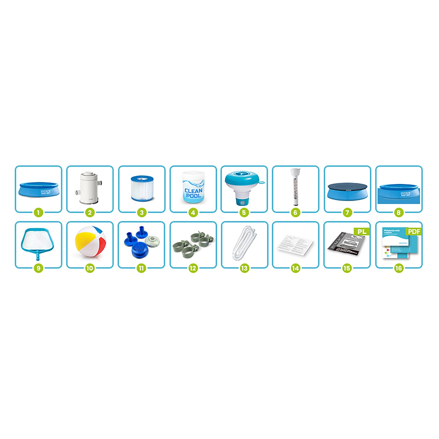 A csomag mindent tartalmaz: medence, patronos szivattyú H szűrővel, multitabletták, adagoló hőmérővel, takaró, alátét, háló, tömlők, bilincsek, szívókosarak, útmutató, javítófolt és strandlabda. Egyszerű indulás további vásárlások nélkül.