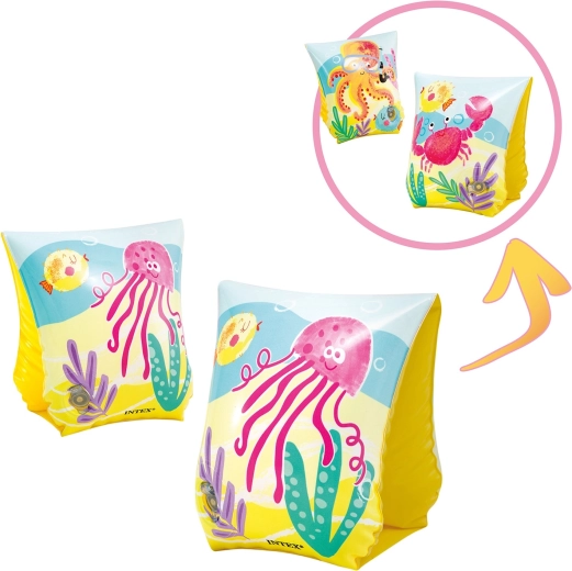 Az élénk sárga szín és a játékos tengeri motívumok javítják a gyermek láthatóságát a vízben, így mindig könnyen szemmel tartható. A karúszók egyszerűen felvehetők, és a csúszásgátló felületnek köszönhetően jól a karon maradnak, hogy úszás vagy játék közben kevésbé csússzanak el.