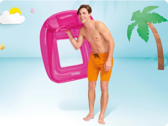 A rózsaszín Intex felfújható karosszék ideális a nyugodt lebegéshez tavakon, medencékben és a tengeren. Az ergonomikus háttámla és a hálós ülőrész kellemes kényelmet, valamint vízáramlást biztosít a forró napokon történő hűsítéshez. Két különálló légkamrája növeli a stabilitást és a biztonságot használat közben.