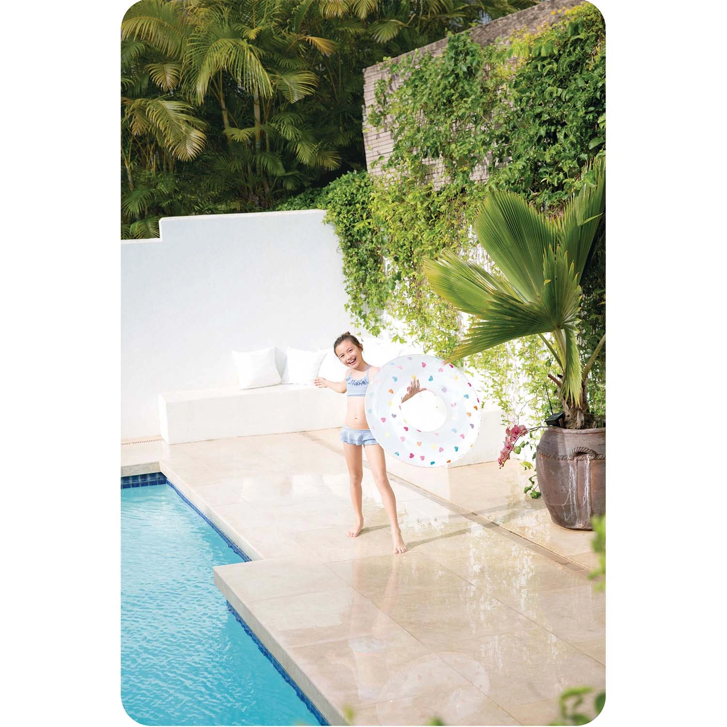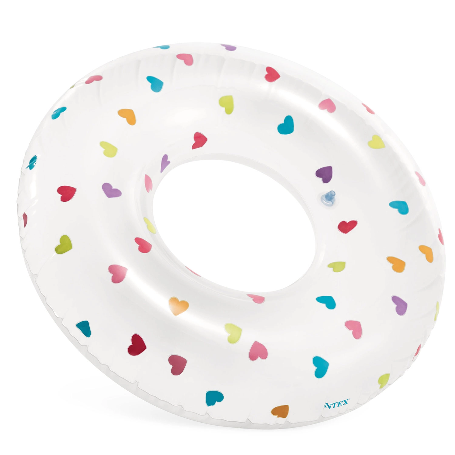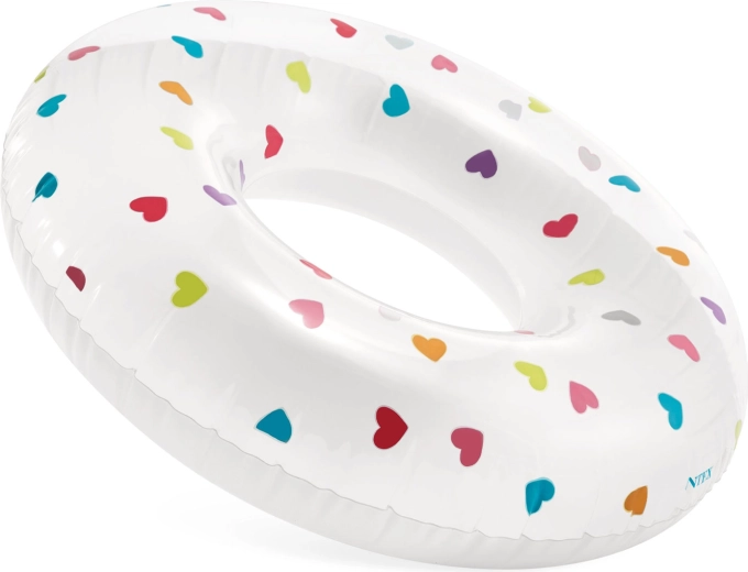 A fehér úszógumi színes szívecskékkel feltűnő és könnyen észrevehető medencében és tengerben egyaránt – ideális a biztonságosabb szórakozáshoz és a szép nyári fotókhoz.