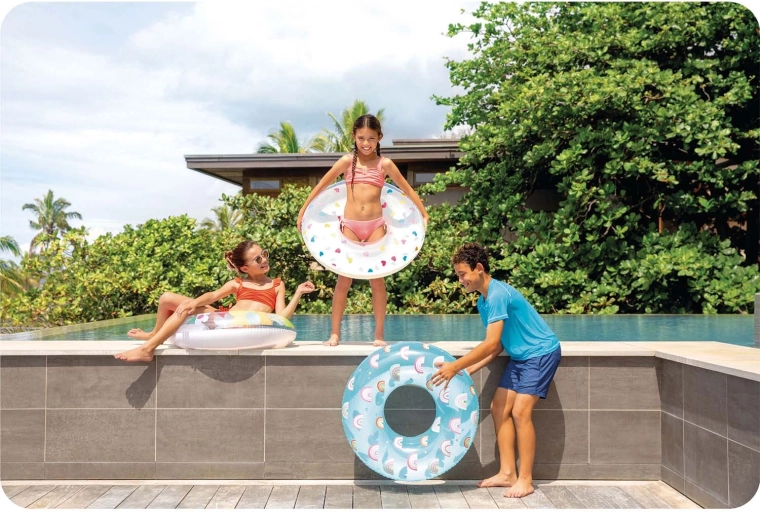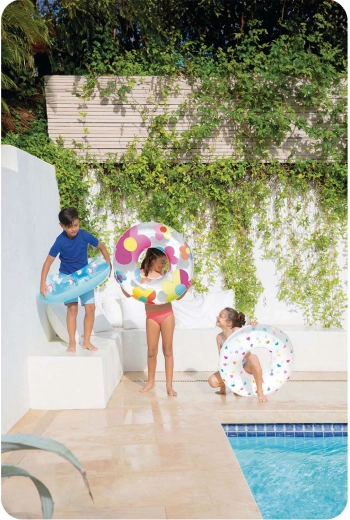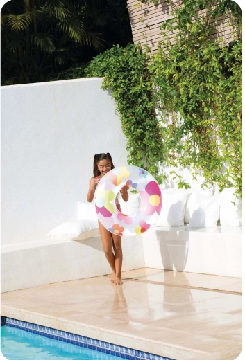 A praktikus szelep gyors felfújást és leeresztést tesz lehetővé. A fényes PVC felület egyszerűen letörölhető, és egész nap tisztán tartható a medence mellett is.