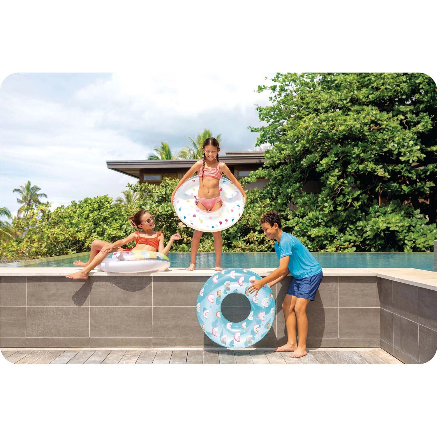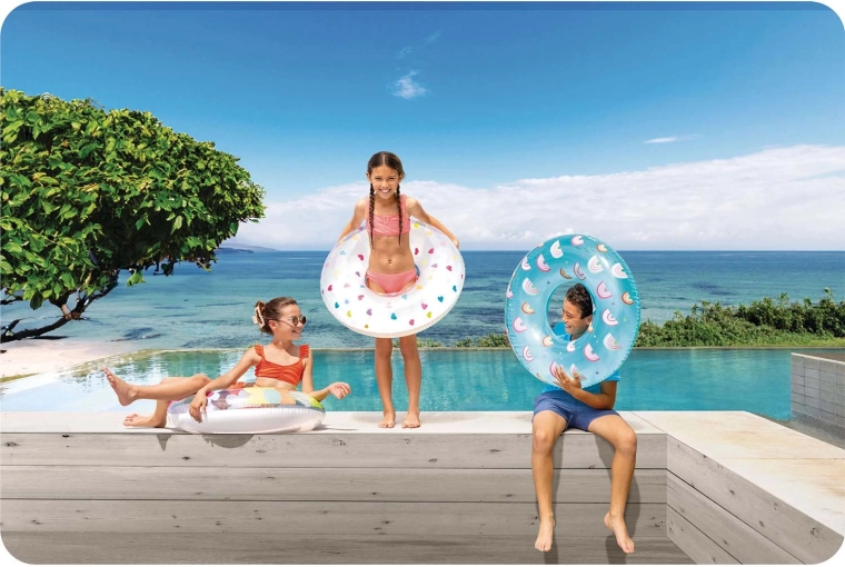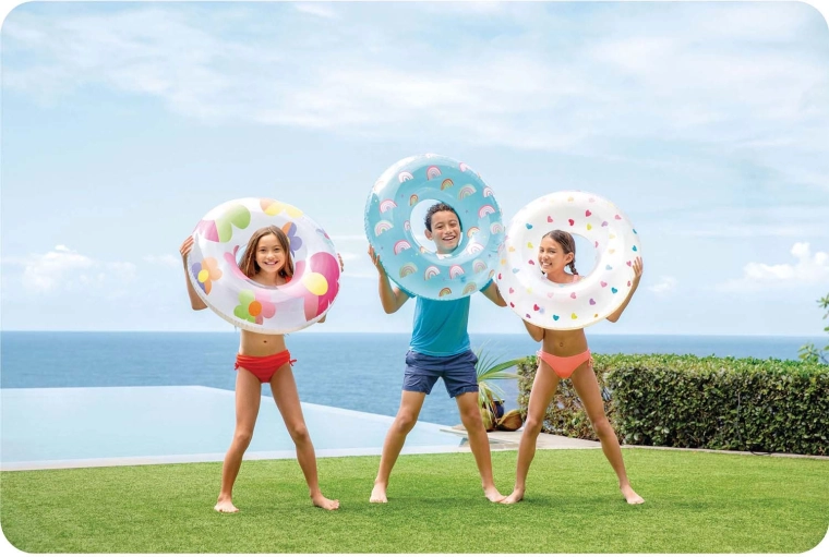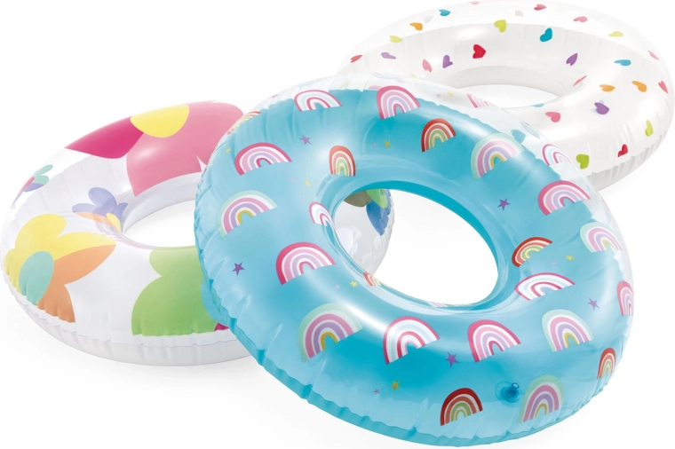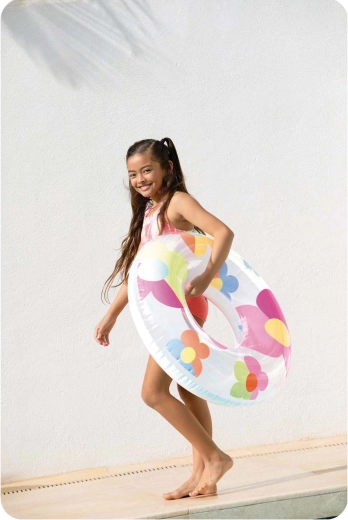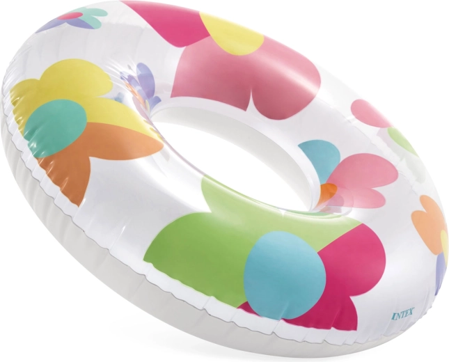 Stílusos INTEX úszógumi színes virágokkal, rengeteg szórakozást és kényelmes pihenést kínál a vízen. Az átlátszó és fehér kivitel élénk színekkel jól látható, és minden nyári fotón jól mutat. A 0,2 mm vastag, minőségi PVC-nek köszönhetően a gumi könnyű, mégis ellenálló a kisebb karcolásokkal szemben.
