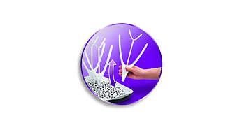 A Philips Avent szárítóállványt úgy tervezték, hogy gyors és áttekinthető szárítást biztosítson a mindennapi etetési kellékekhez. Az okos tüskerendezésnek köszönhetően akár 8 üveg, etetőcumik, gyűrűk, mellszívó-alkatrészek és egyéb kiegészítők is elférnek rajta. A kivehető tálca felfogja a lecsöpögő vizet, így a munkafelület száraz és tiszta marad.