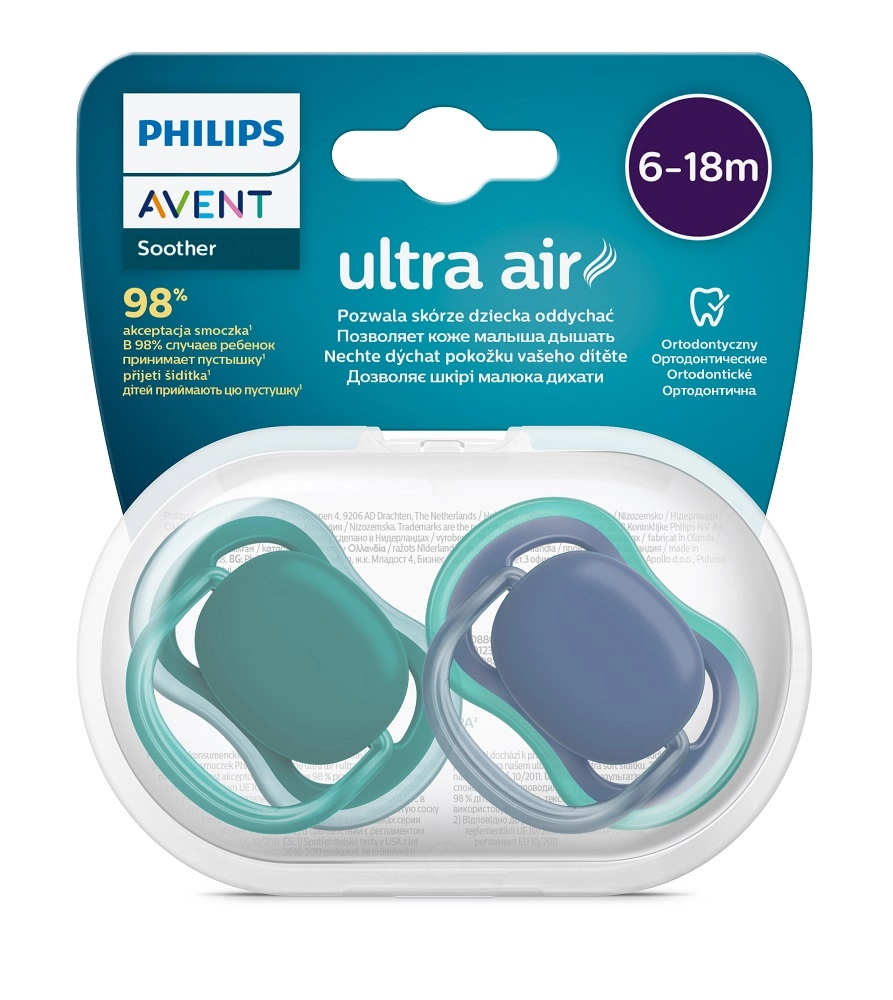 A Philips Avent Ultra Air könnyű, kényelmes és jól szellőző cumi, amelyet úgy terveztek, hogy minimálisra csökkentse a bőrirritációt a száj körül. A nagy szellőzőnyílásoknak köszönhetően a baba bőre szárazabb marad még hosszabb használat mellett is. A szilikon, texturált szívófej természetes hatású és kellemes tapintású.