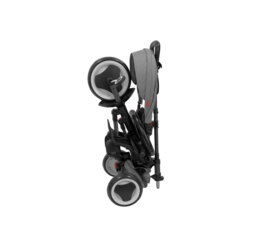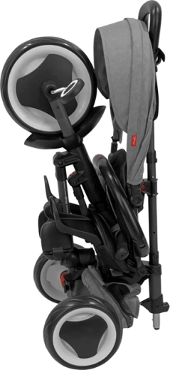 A biztonságról 5 pontos biztonsági öv, levehető védőrúd és hátsó kerékfékek gondoskodnak. Az rezgéscsillapító EVA kerekek elnyelik az egyenetlenségeket és nem igényelnek karbantartást. A kompakt tárolás és a gyors kezelés alap: a tricikli 3 kattintással, szerszám nélkül összecsukható, és az okos kialakítás révén összecsukva kényelmesen húzható, mint egy bőrönd.