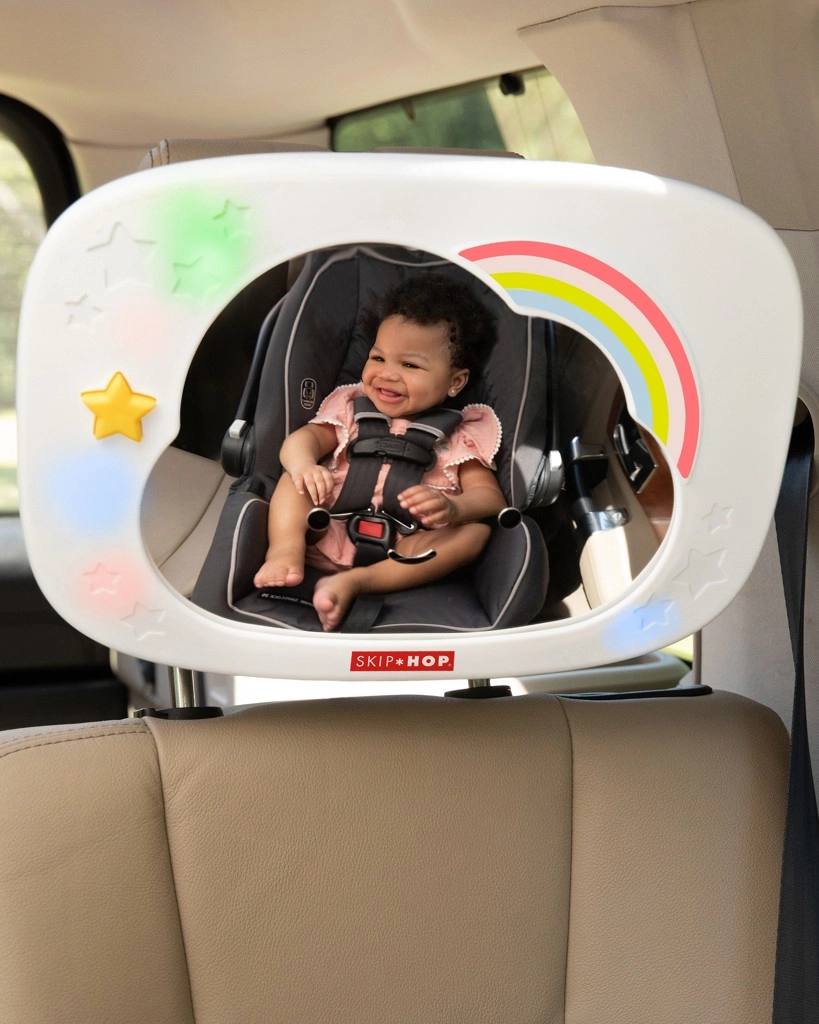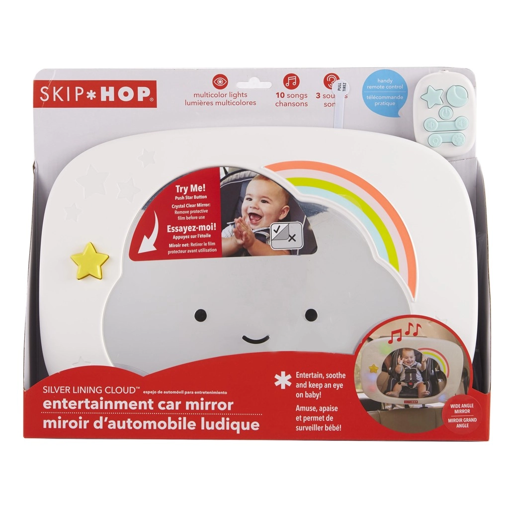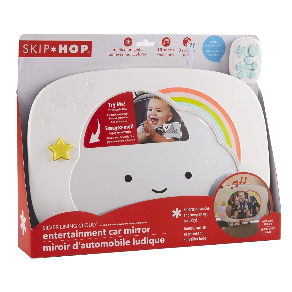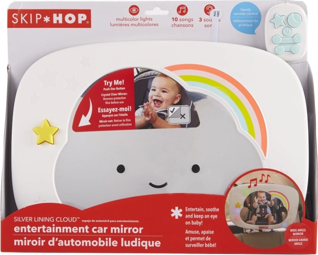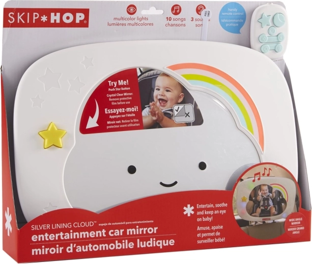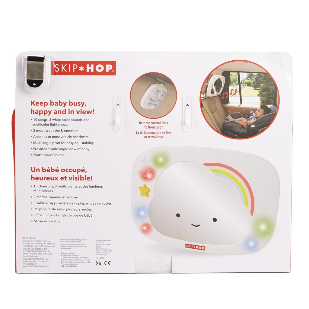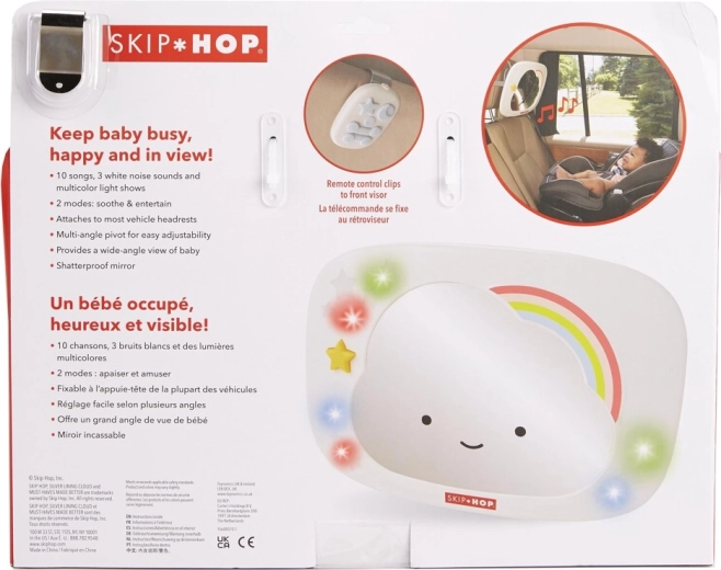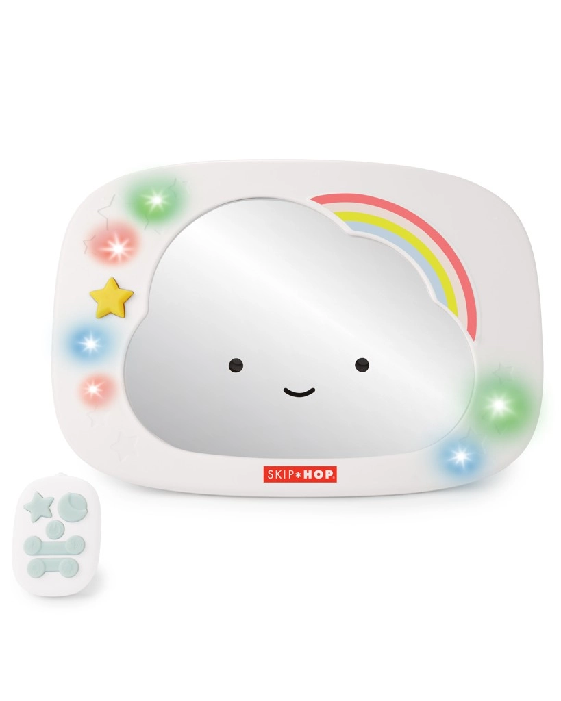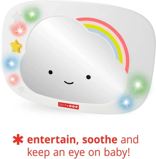 A SKIP HOP bájos, felhő alakú autós gyerekülés-tükre segít a szülőknek szemmel tartani a babát, miközben szórakoztatja és megnyugtatja őt. Többszínű LED fényeket, zenét és fehér zajt, klipszes távirányítót, valamint széles látószöget kínál a nagy, ívelt tükörfelületnek és a többirányú csuklónak köszönhetően.