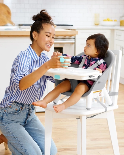 A Skip Hop EON 4 az 1-ben stílusos magas etetőszék, amely alkalmazkodik gyermekének életkorához és igényeihez. Bükkfa lábainak, elegáns szürke ülésének és stabil felépítésének köszönhetően biztonságos és kényelmes ülést kínál asztalnál vagy tálcával. Értékelni fogja a könnyű tisztítást – a tálca mosogatógépben mosható, a felületek pedig nedves ruhával törölhetők.