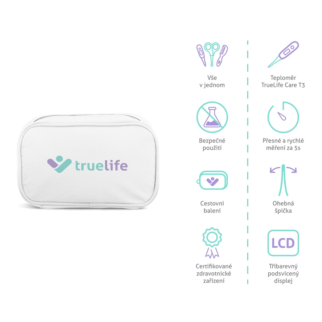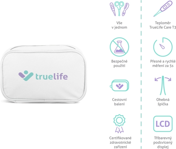 - TrueLife Care T3 hőmérő, orrszívó, lekerekített végű körömolló, körömcsipesz, fésű, puha sörtéjű kefe, ujjas fogkefe, 3× körömreszelő, utazótok, használati útmutatók és biztonsági előírások