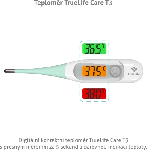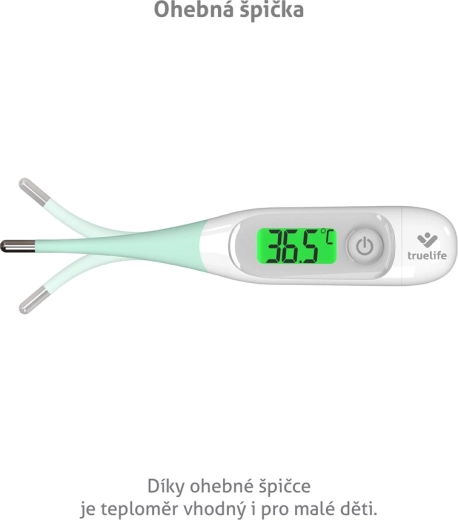 A TrueLife Care T3 5–10 mp alatt mér hőmérsékletet, 3 színű háttérvilágítással a gyors értékeléshez, rugalmas heggyel és az utolsó 10 mérés memóriájával. A fürdővíz hőmérsékletét is méri.